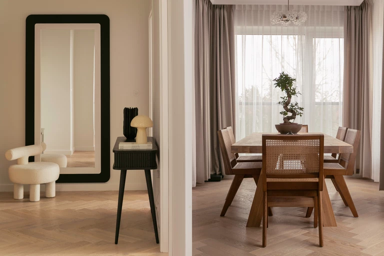 Właścicielom zależało, by stworzyć klasyczną, ponadczasową przestrzeń utrzymaną w stonowanej palecie, którą łatwo będzie można „ożywić” dodatkami, takimi jak obrazy, dywany, wazony czy kwiaty. We wnętrzu dominuje więc biel i beże, są też wyraziste czarne akcenty, nieco złota oraz pastelowego różu.