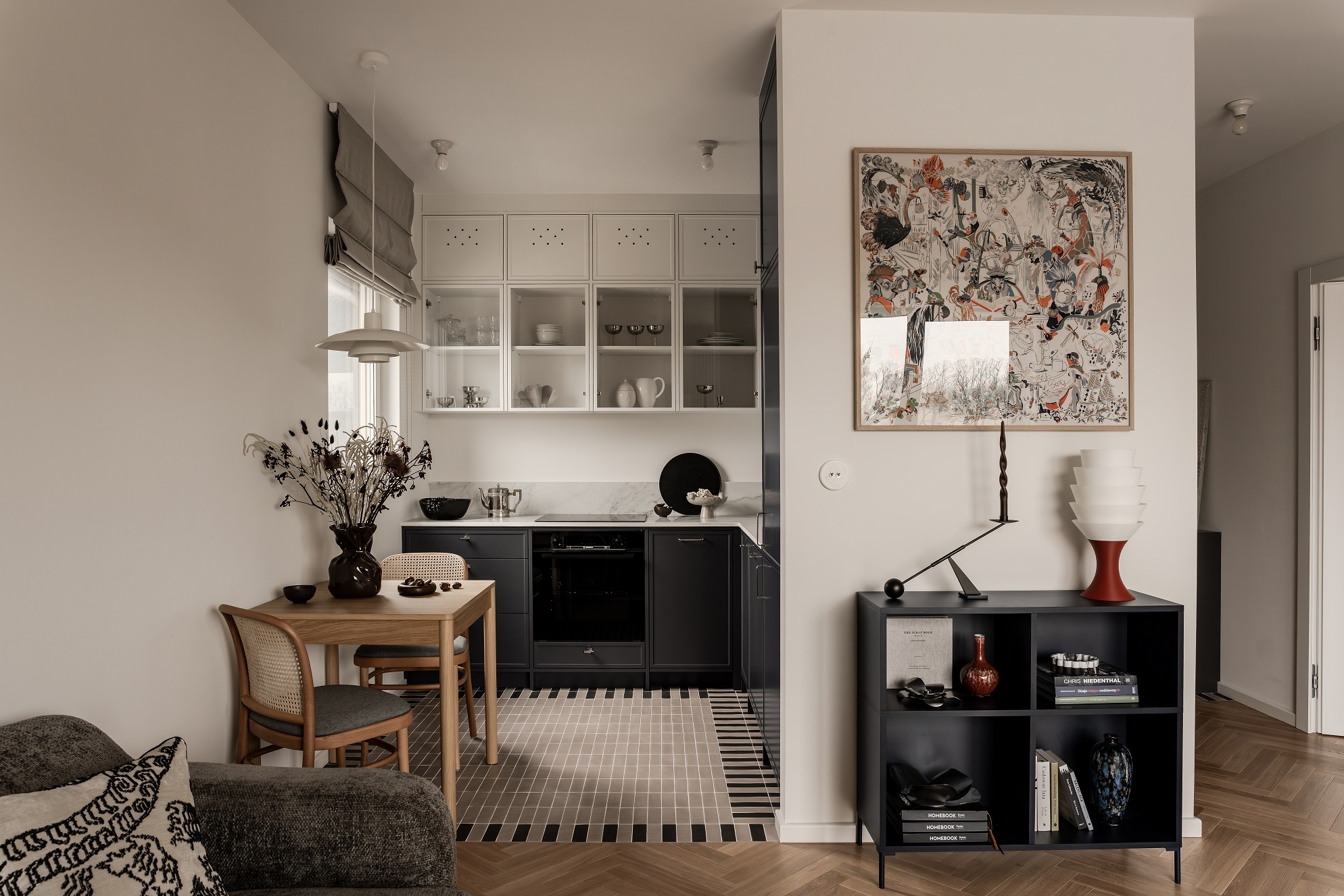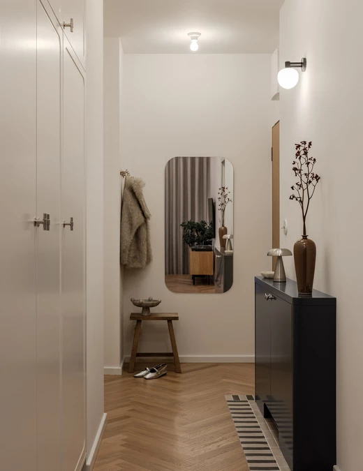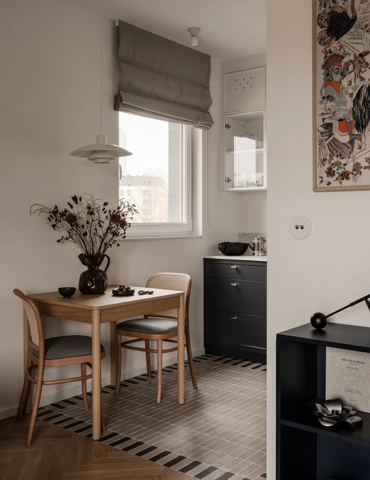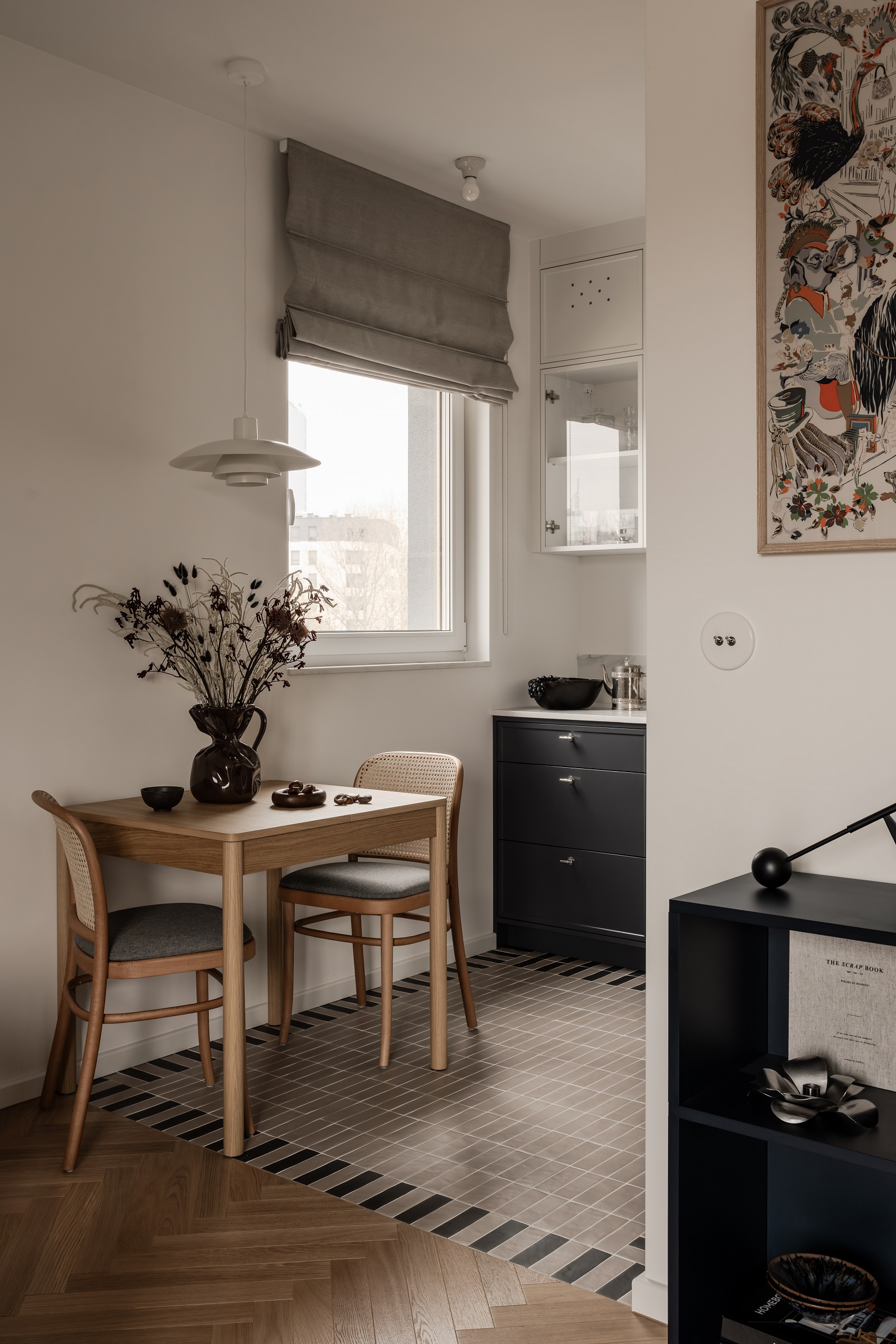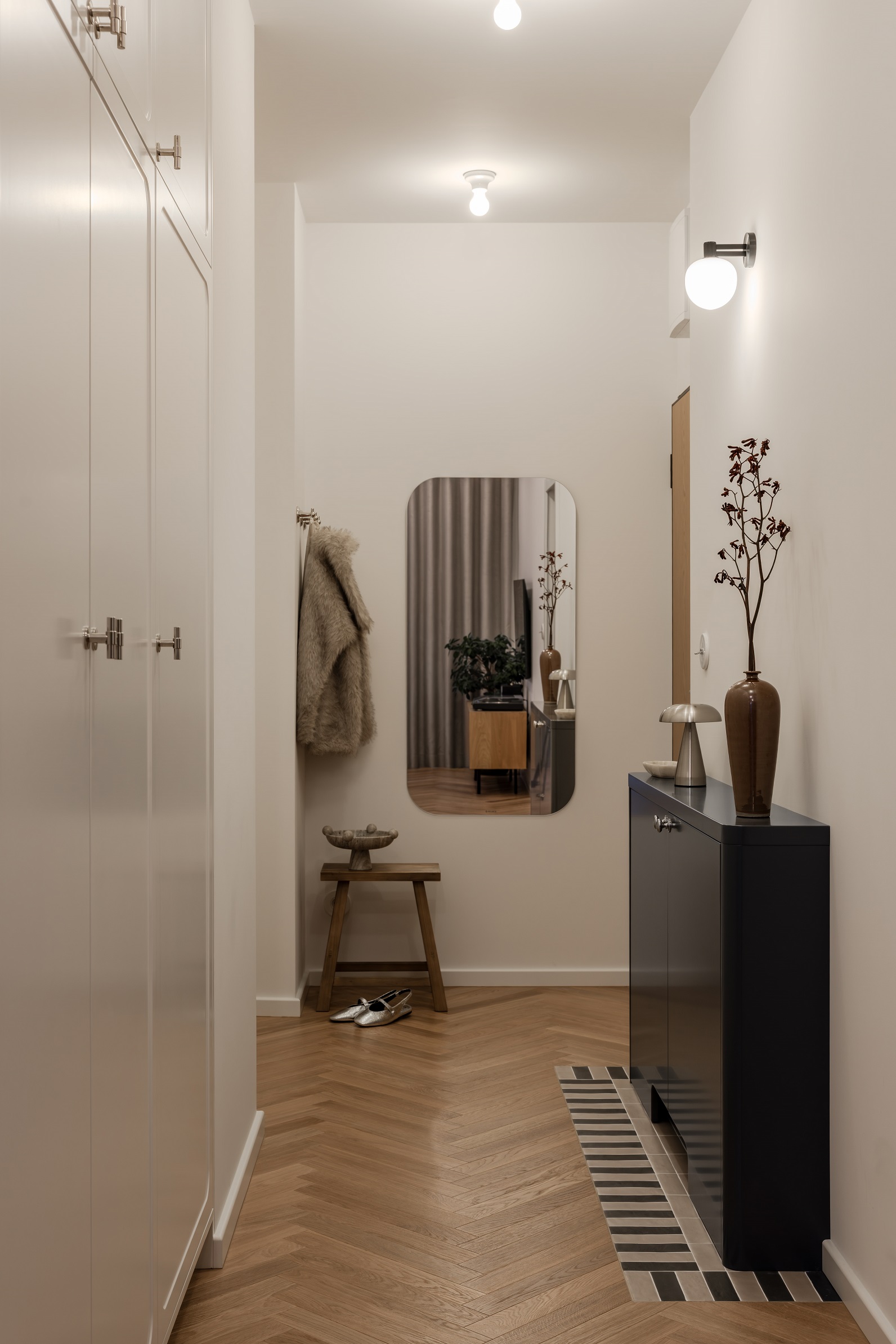 Na niewielkiej powierzchni architekci stworzyli mieszkanie oszczędne w formie, które jednocześnie unika chłodu typowego dla minimalistycznych realizacji. Zestawienie geometrycznych wzorów z zaobleniami, zróżnicowanymi strukturami materiałów oraz uważnie dobraną sztuką sprawia, że przestrzeń jest dopracowana estetycznie i gotowa na codzienne życie pary, dla której design jest elementem codzienności.