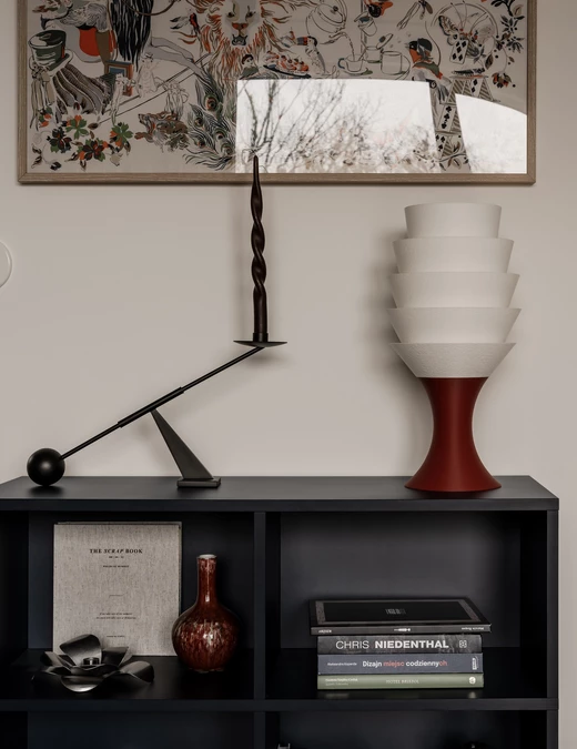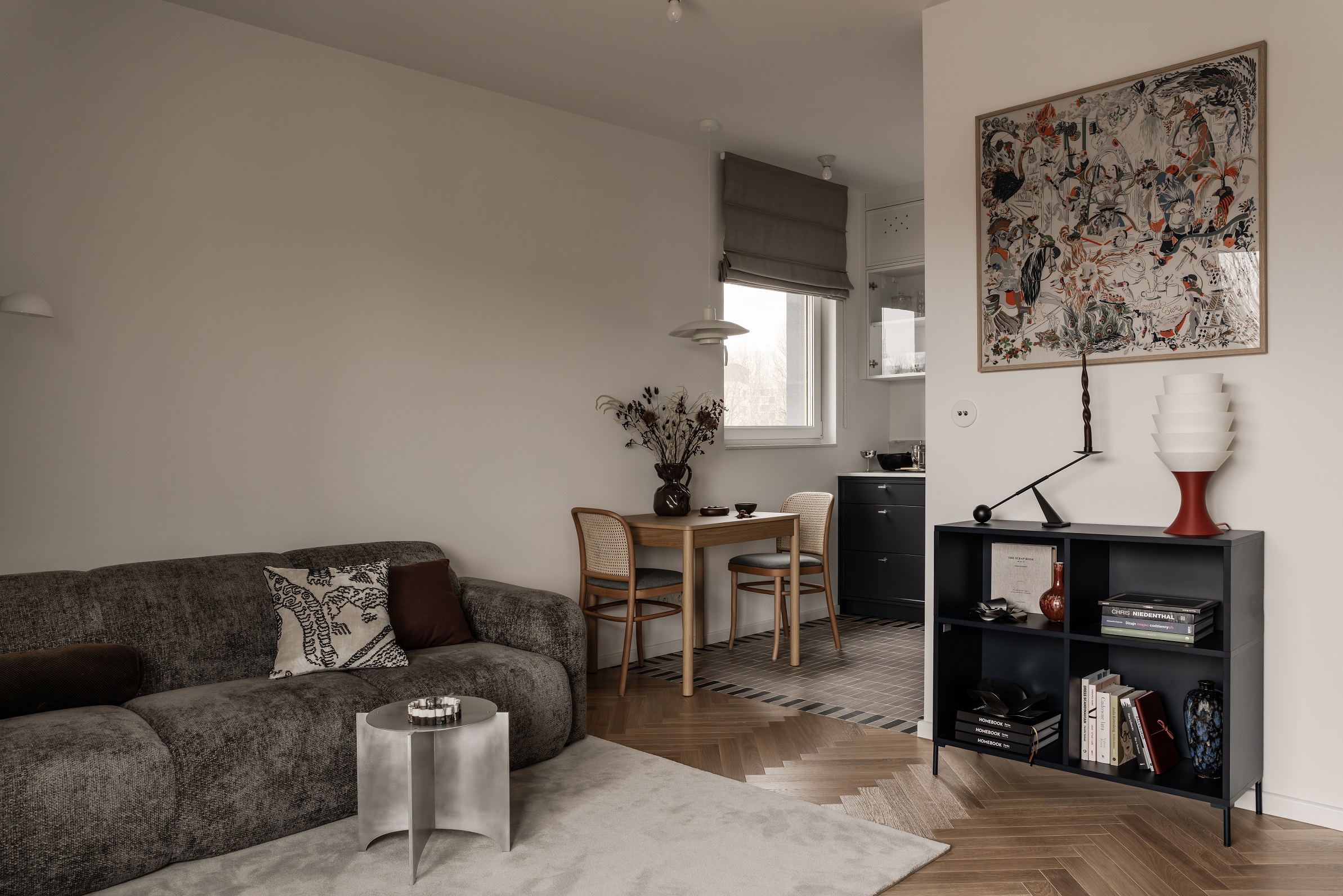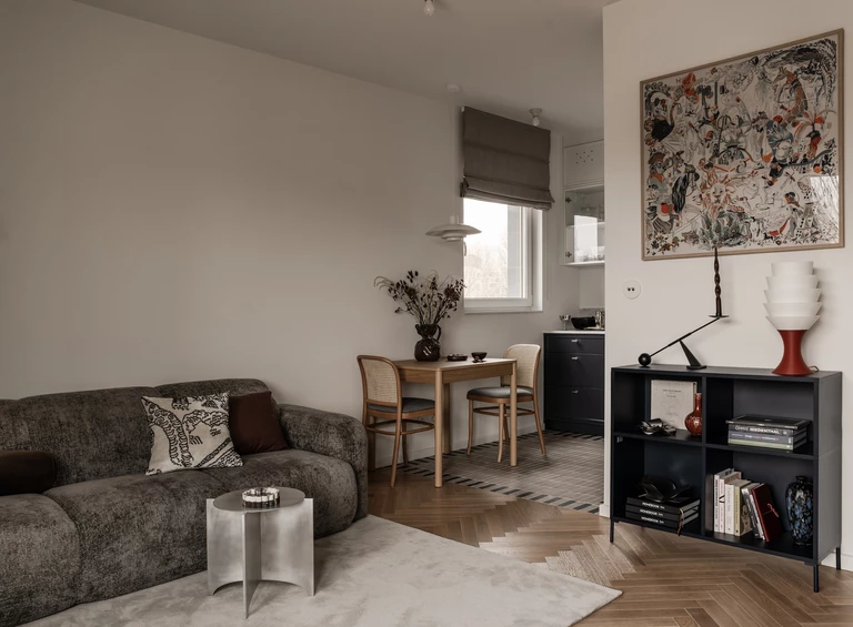 Mieszkanie o powierzchni 46 metrów kwadratowych zostało zaprojektowane dla małżeństwa, które od początku bardzo precyzyjnie definiowało swoje potrzeby. Właściciele, którzy interesują się sztuką i designem, mieli jasno określoną estetykę. Oczekiwali wnętrza o czystej formie, w stonowanej kolorystyce, ale bez chłodu kojarzonego z minimalistycznymi realizacjami. Projektanci Emilia Wójcicka i Konrad Krusiewicz z Noon Studio potraktowali tę przestrzeń jako pole do pracy z kształtami, fakturami i kontrastami, z licznymi odwołaniami do stylu vintage. Kolekcje książek, albumów i dzieł sztuki, którymi para wypełniła mieszkanie, domknęły koncepcję i nadały jej osobistego charakteru.