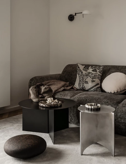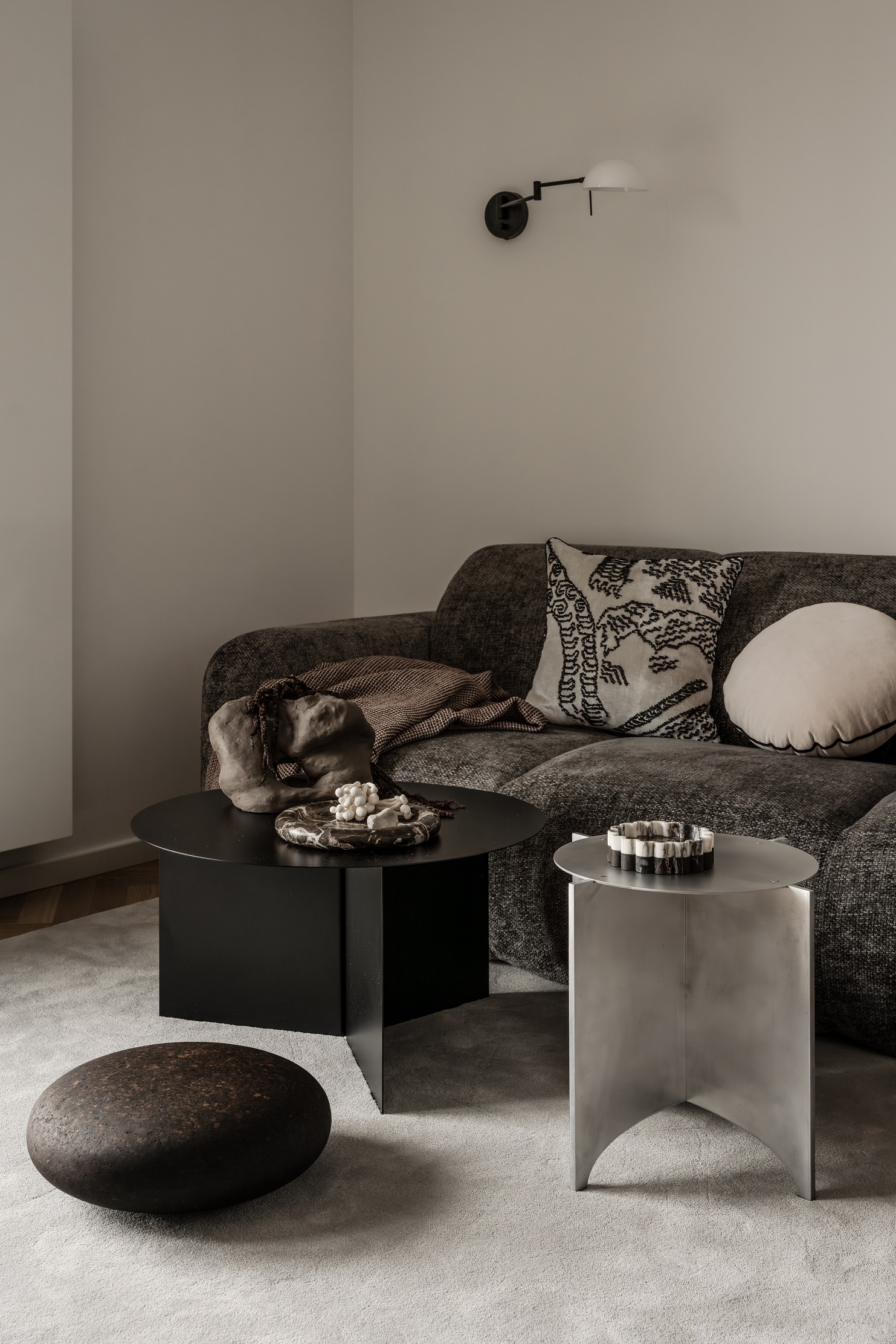 Projekt salonu opiera się na minimalistycznym doborze mebli i bazuje na zróżnicowaniu faktur i wzorów. Architekci zestawili duży, czarny stolik Hay z wielofunkcyjnym meblem ze stali, który w zależności od potrzeby może działać jako pufa albo stolik pomocniczy. Na jednej ze ścian zawisła oprawiona w ramę chusta Hermès, która zastępuje standardowy obraz.