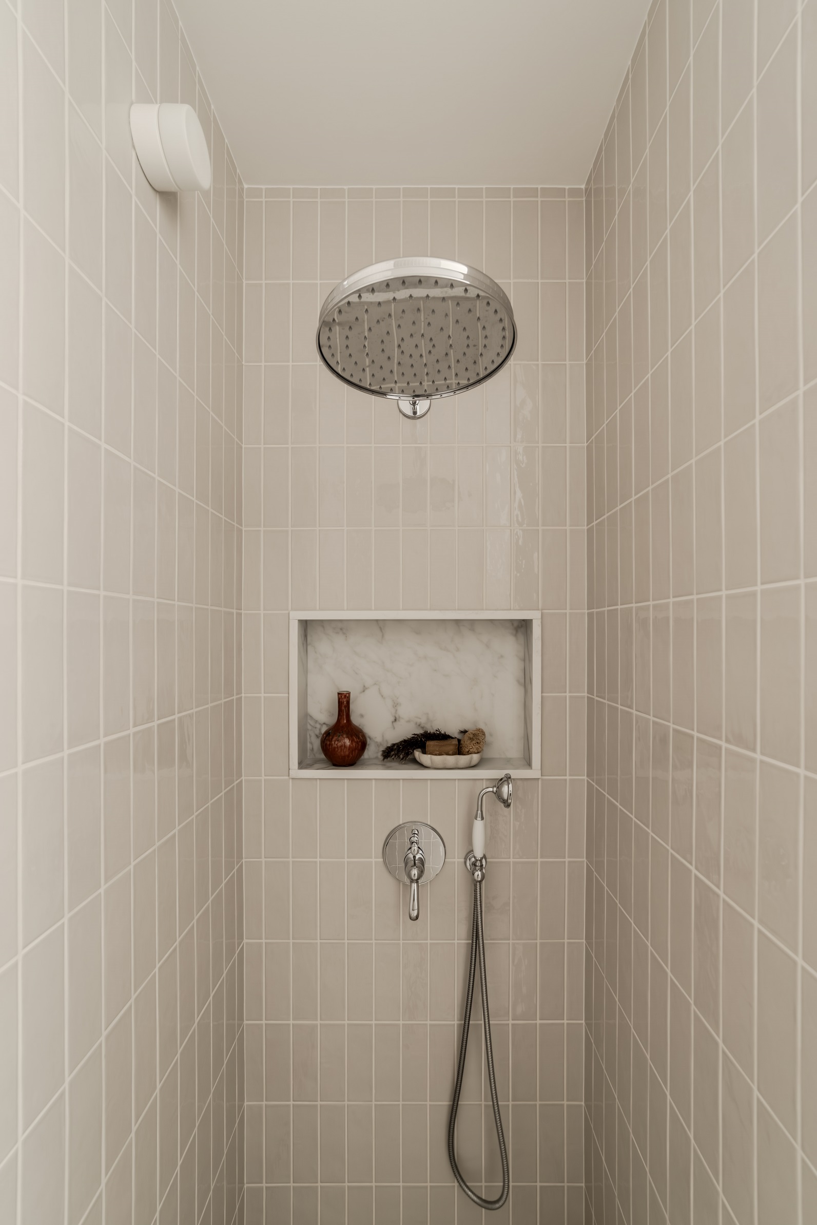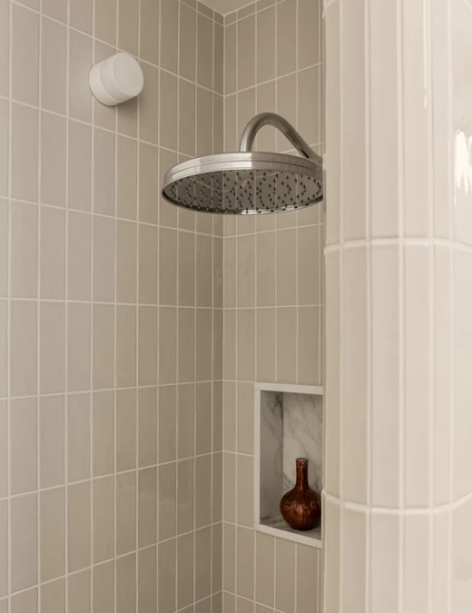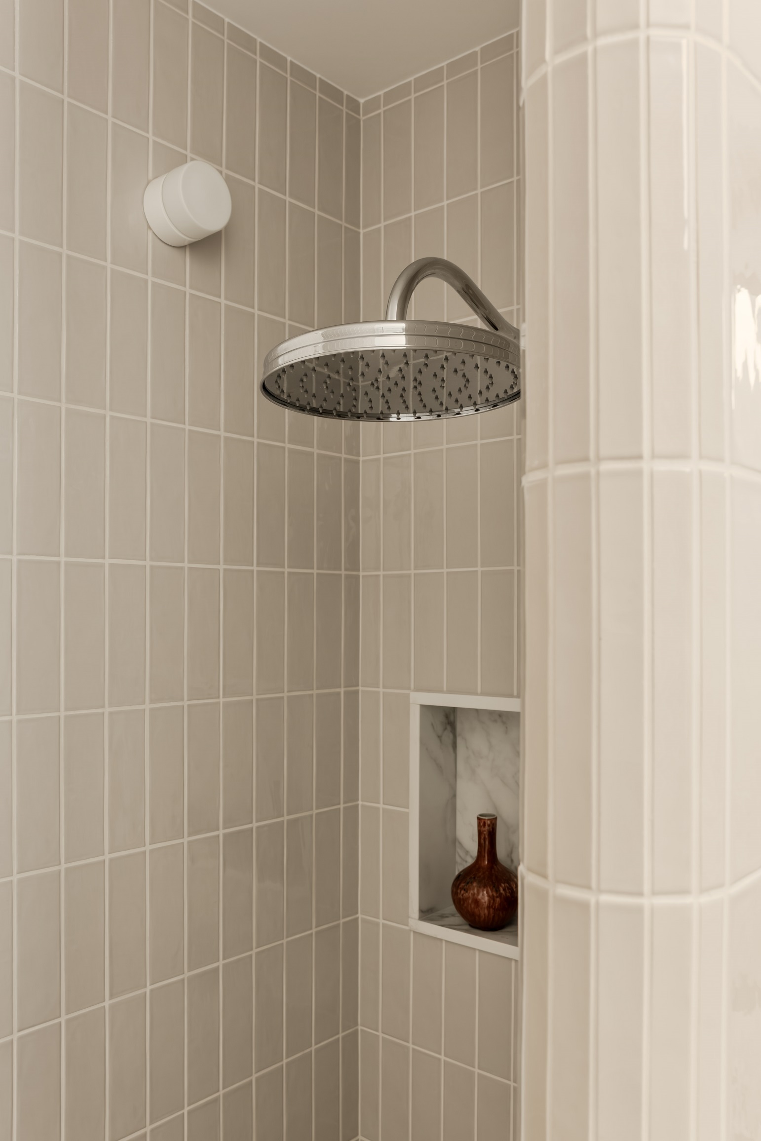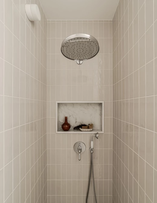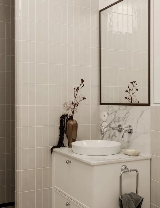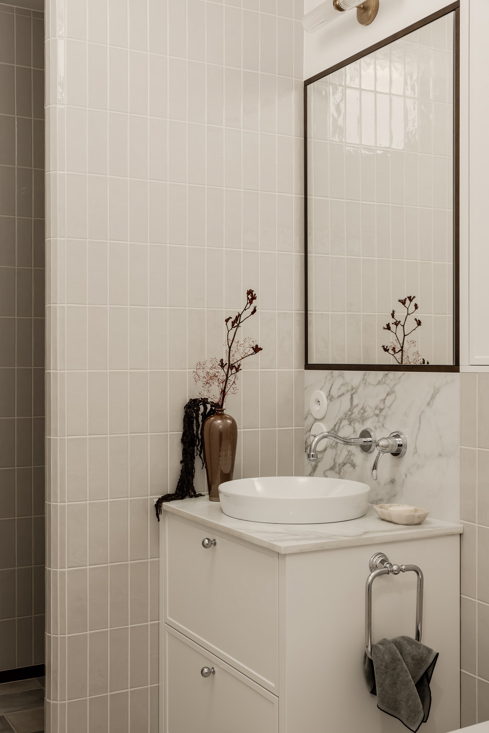 W łazience projektanci zaprojektowali zaobloną ścianę wydzielającą prysznic, wyłożoną płytkami, która prowadzi wzrok po pomieszczeniu. Na podłodze pojawiła się klasyczna szachownica w beżowo-szarej tonacji, zwieńczona bordowym cokołem wprowadzającym wyrazisty akcent kolorystyczny.