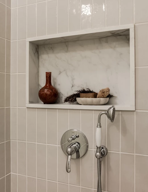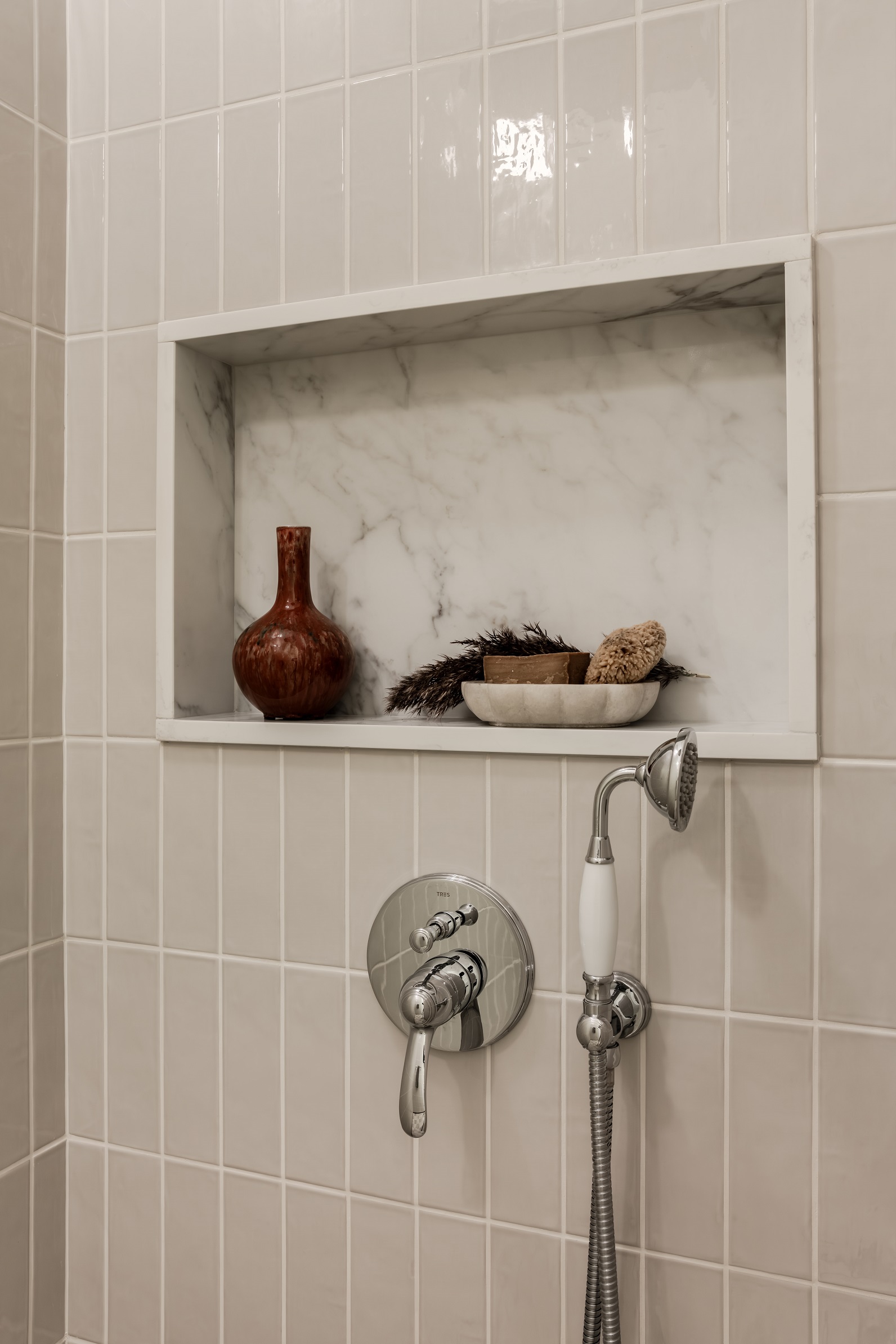 Nad szafką umywalkową znalazła się rozbudowana zabudowa stolarska z dużą ilością miejsca do przechowywania oraz dodatkowymi gniazdami elektrycznymi schowanymi wewnątrz. Nowoczesną kompozycję przełamuje armatura w stylu retro od firmy Tres, a prysznic doświetlają kinkiety Zangra.