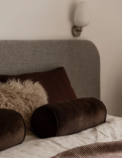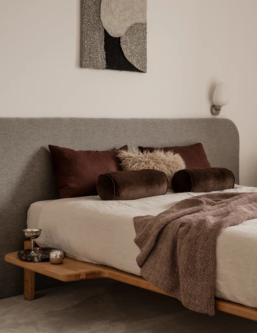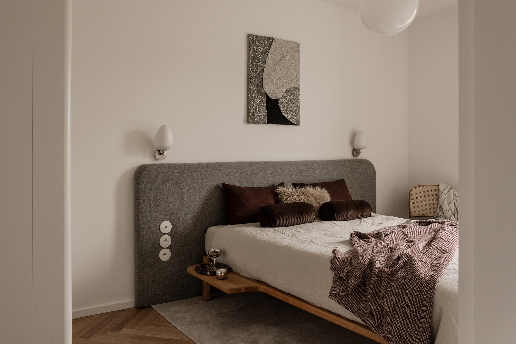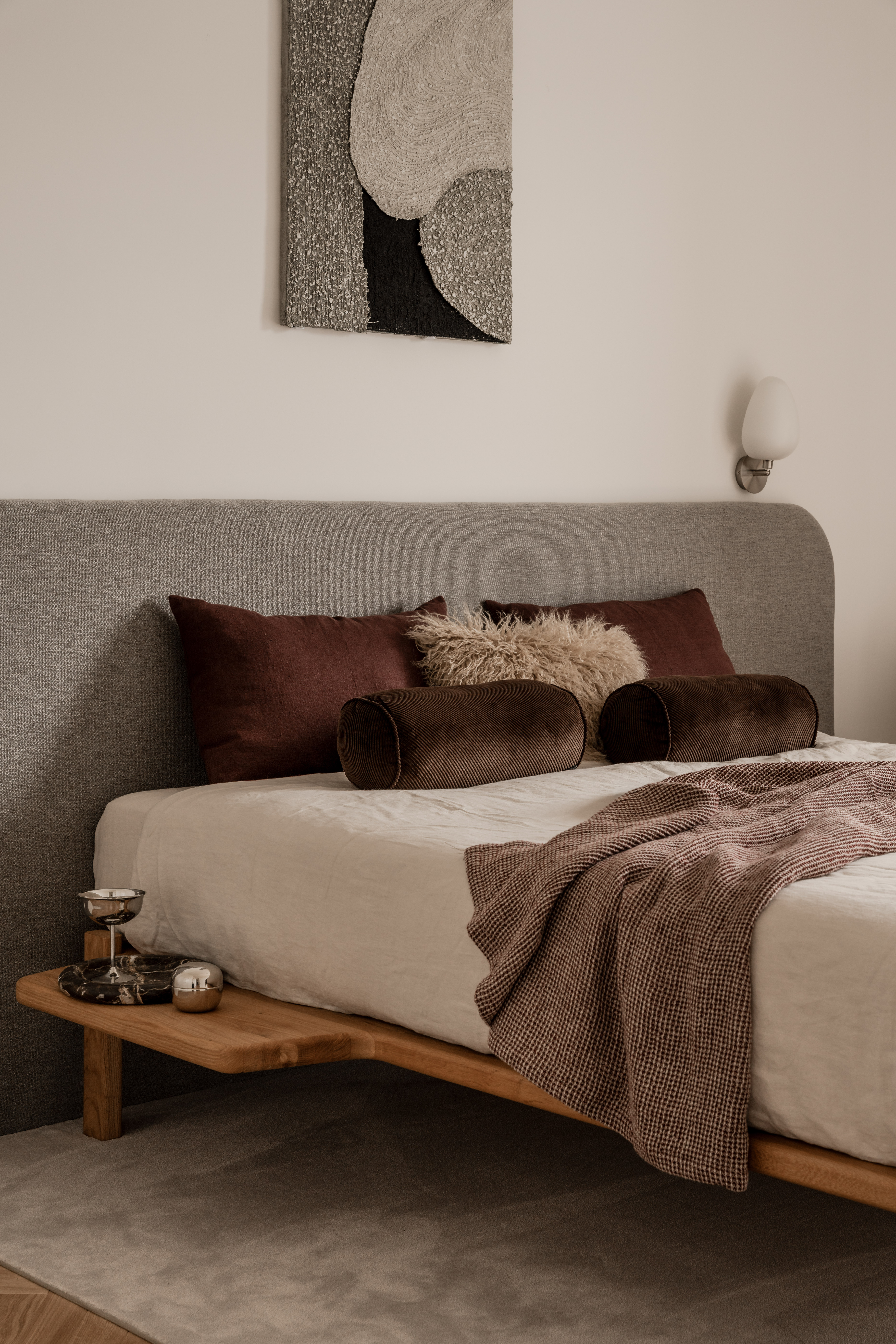 Sypialnia również została opracowana z uwzględnieniem równowagi pomiędzy estetyką i funkcją. Miało być wygodnie, przytulnie i spójnie z resztą wnętrza. W centralnym punkcie sypialni stanęło więc łóżko z dębowej konstrukcji. Projektanci zaprojektowali do niego wykonany na wymiar tapicerowany zagłówek z wbudowanymi gniazdami i włącznikami do kinkietów. To porządkuje okablowanie i ułatwia codzienne użytkowanie.