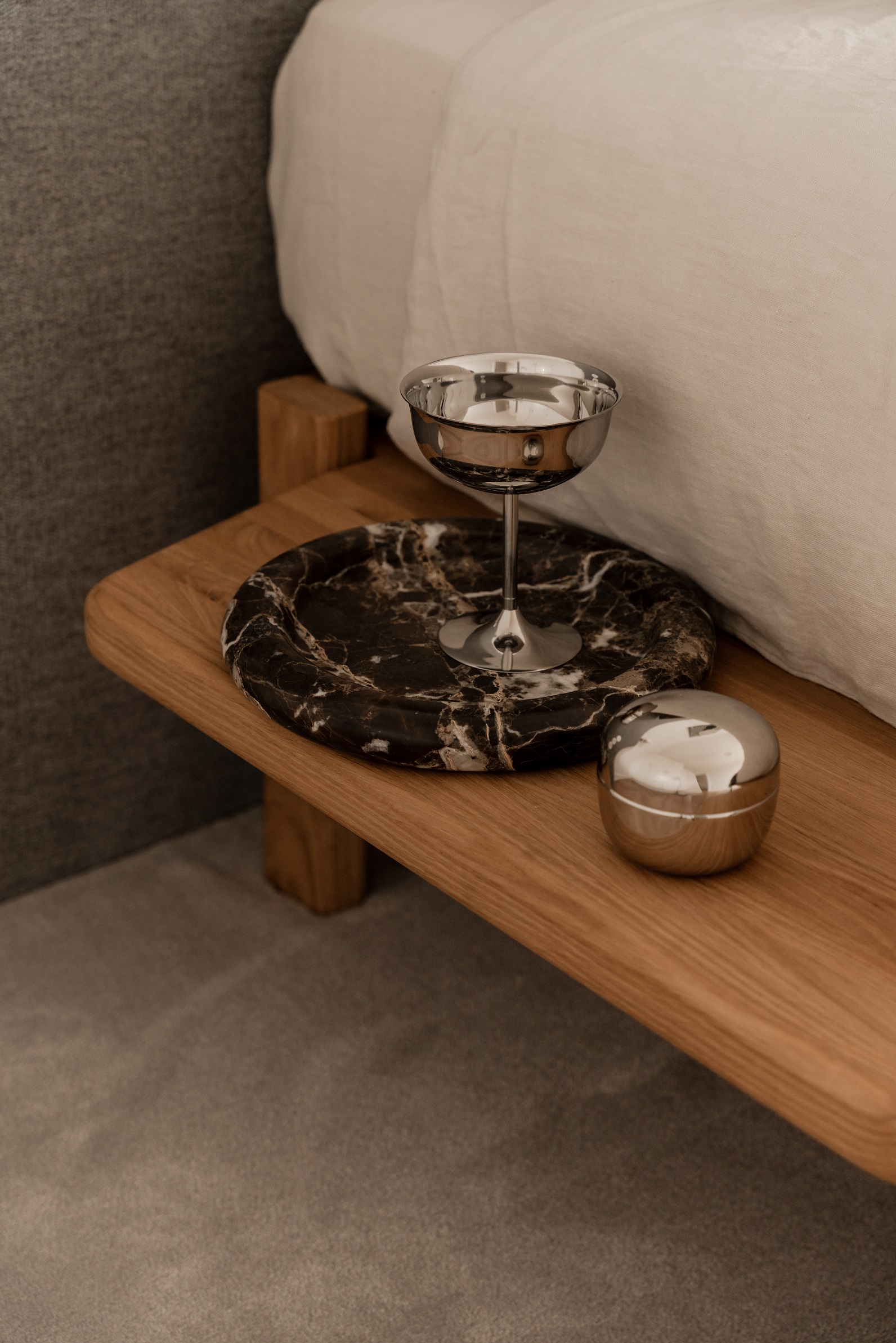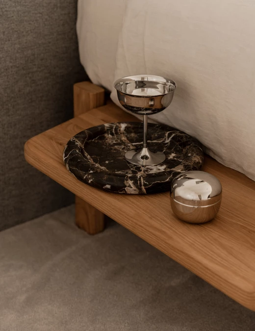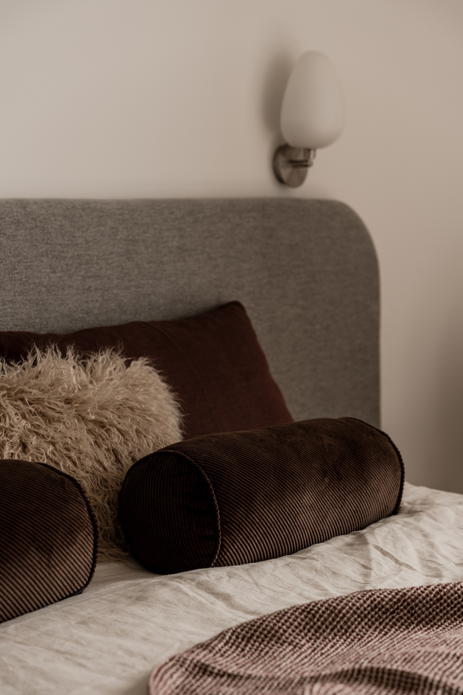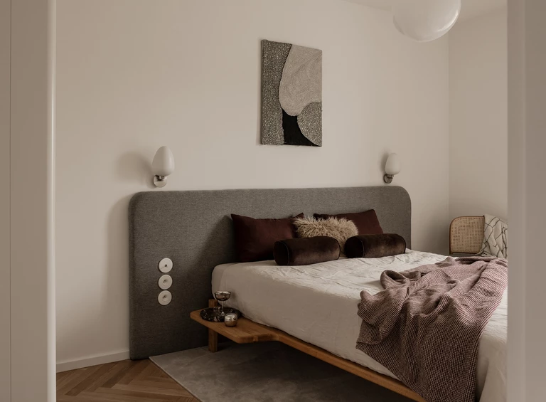 Sypialnia również została opracowana z uwzględnieniem równowagi pomiędzy estetyką i funkcją. Miało być wygodnie, przytulnie i spójnie z resztą wnętrza. W centralnym punkcie sypialni stanęło więc łóżko z dębowej konstrukcji. Projektanci zaprojektowali do niego wykonany na wymiar tapicerowany zagłówek z wbudowanymi gniazdami i włącznikami do kinkietów. To porządkuje okablowanie i ułatwia codzienne użytkowanie.