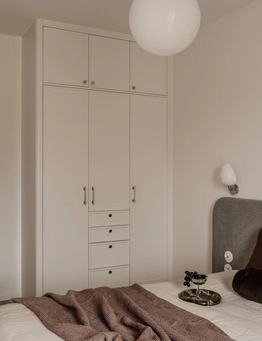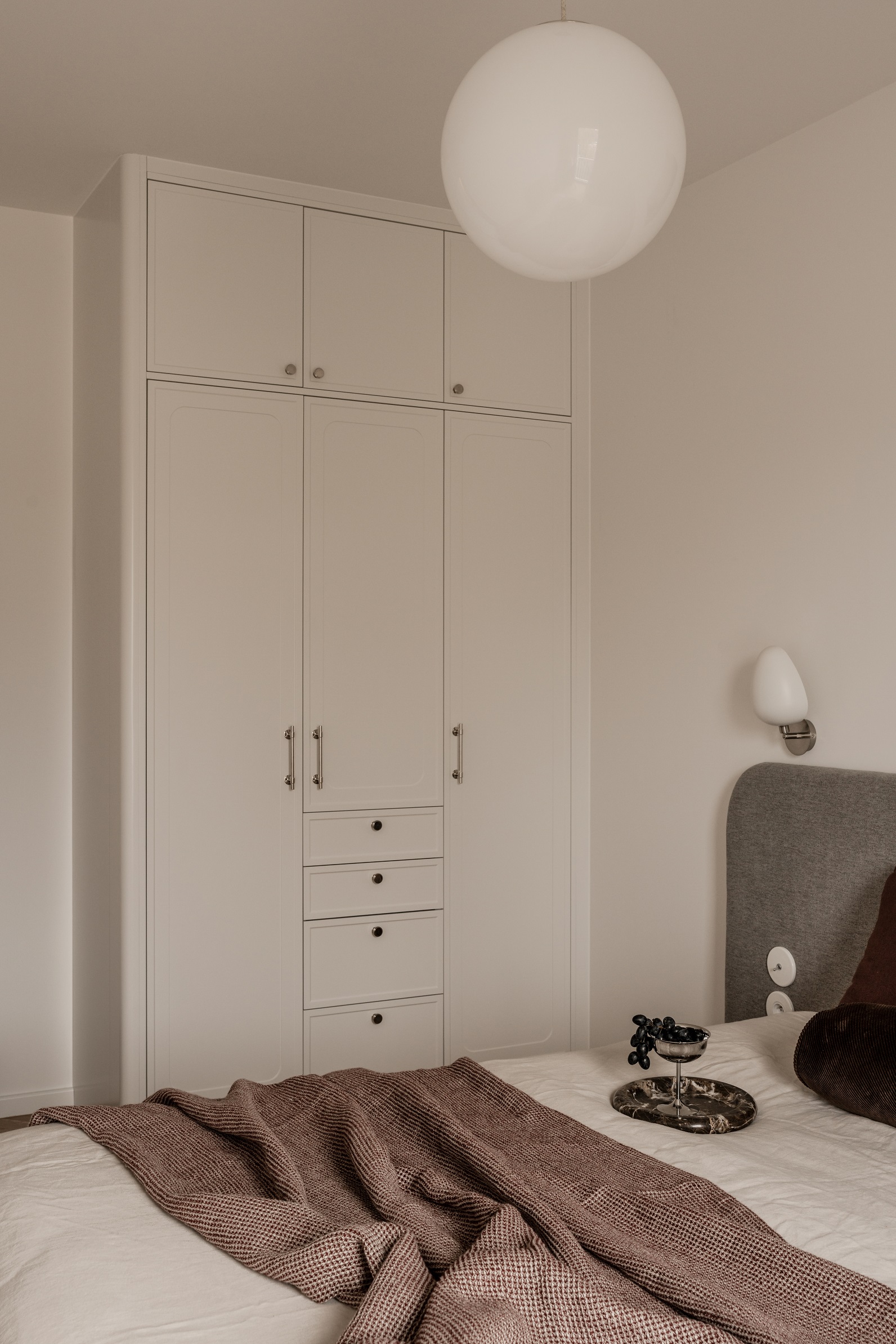 Zaoblona kremowa szafa z chromowanymi uchwytami uzupełnia wnętrze pokoju. Subtelnie nawiązuje do estetyki lat 60. i zapewnia sporo miejsca do przechowywania. Aranżację dopełniają lampa sufitowa Embassy Interiors, kinkiety Aromas oraz obraz Magdaleny Głodek.