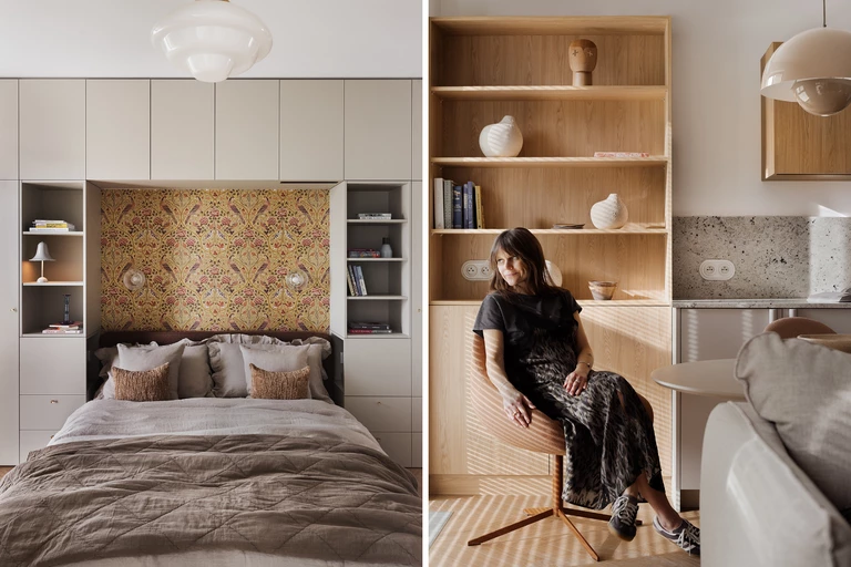 Centralnym punktem tej strefy jest okazała zabudowa wokół łóżka. Projekt ten nie tylko porządkuje przestrzeń i zapewnia sporo miejsca do przechowywania, ale także tworzy elegancką oprawę. W tej strefie pojawiła się tapeta z kultowym wzorem „Seasons by May” autorstwa Williama Morrisa – projektanta, który jak nikt inny potrafił połączyć sztukę z naturą. Na jej tle stanęło łóżko w głębokim, czekoladowym odcieniu, obite miękką tkaniną bouclé, które zdobią piękne tekstylia pochodzące z żoliborskiego showroomu Conco.