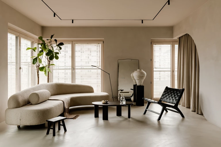 Z tego względu niemal całe mieszkanie pokryto beżowym tynkiem – łącznie z frontami kuchennymi. Na podłodze położono mitkrocement w tym samym odcieniu. Nie zabrakło tu form w kształcie fal: można je dostrzec na blacie baru, zakrzywionej ścianie, a także wnęce prowadzącej z części dziennej do sypialni, którą osłaniają aksamitne zasłony. Wszystkie te elementy dały razem oryginalny, rzeźbiarski efekt.