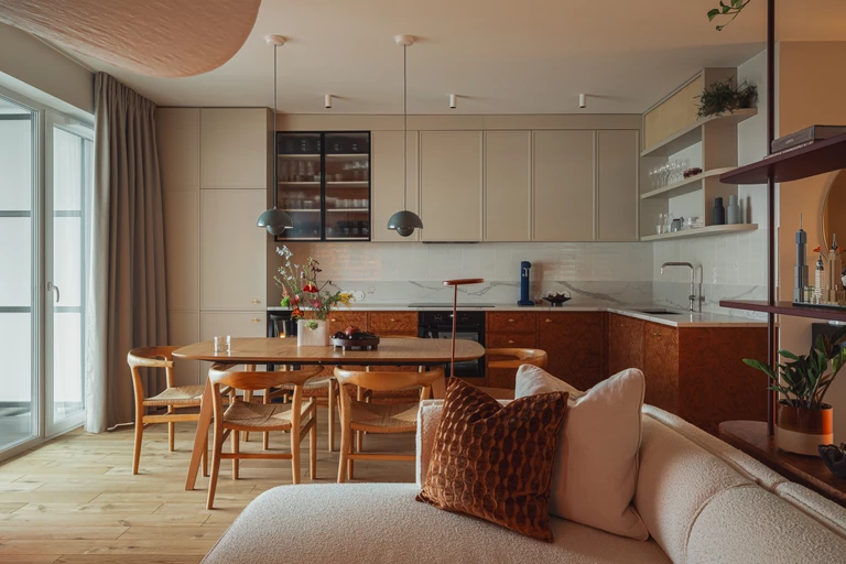 We wnętrzu spotykają się starannie dobrane polskie i skandynawskie marki, które łączą wysoką estetykę z funkcjonalnością. Centralnym punktem życia codziennego stał się stół marki BoConcept, przy którym toczą się rodzinne i towarzyskie spotkania. Strefę relaksu tworzą sofa wypoczynkowa od Optisofa oraz stolik kawowy od Tamo.