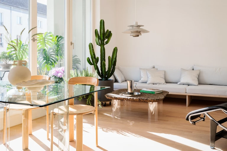 To właśnie zgromadzone przez Agnieszkę Kuczyńską ikony dizajnu i znaleziska z drugiej ręki są jednym z bohaterów tego wnętrza. W salonie uwagę przykuwa szezlong „LC4” projektu Le Corbusiera. Towarzyszy mu stolik z korkowym blatem zaprojektowany przez architektkę i kanapa, która trafiła tu z poprzedniego mieszkania Agnieszki.