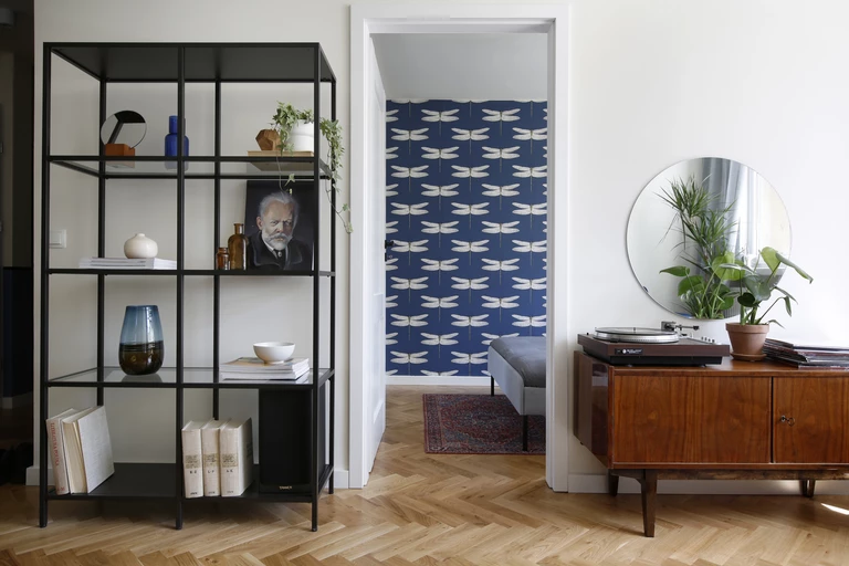 Punktem wyjścia dla projektu była oryginalna niebieska tapeta w ważki, która znalazła się w sypialni. Odcienie barwy niebieskiej przenikają całe mieszkanie – w tym kolorze jest sofa w salonie, szafa w przedpokoju oraz kafelki na ścianach w łazience.