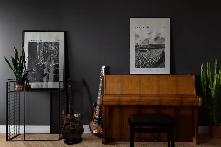 Uwagę skupia pianino po babci, które ma dużą wartość sentymentalną oraz ulubione gitary polskiej firmy Mayones Guitar & Bassis. Pianino wnosi do wnętrz ducha vintage. Klimatycznym elementem jest przepiękna olejowana podłoga ułożona w tradycyjną jodełkę.