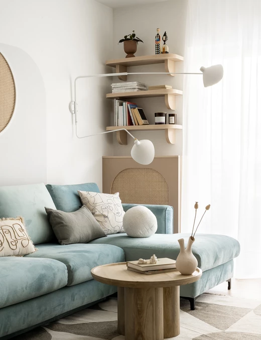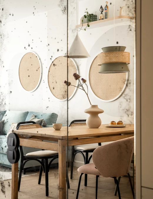 Strefa wypoczynkowa została zaaranżowana wokół błękitnego narożnika, nad którym zawisły okrągłe dekoracje z plecionki wiedeńskiej. W tej części mieszkania znalazło się też miejsce na niewielką biblioteczkę ze wstawkami z ratanu, witrynkę, pufy oraz szafkę RTV. „Właścicielom zależało na tym, żeby w zmyślny sposób ukryć telewizor, dlatego razem zaplanowaliśmy zastosowanie w tej strefie urządzenia z opcją wyświetlania obrazu” - tłumaczy Magda Szczepaniak.