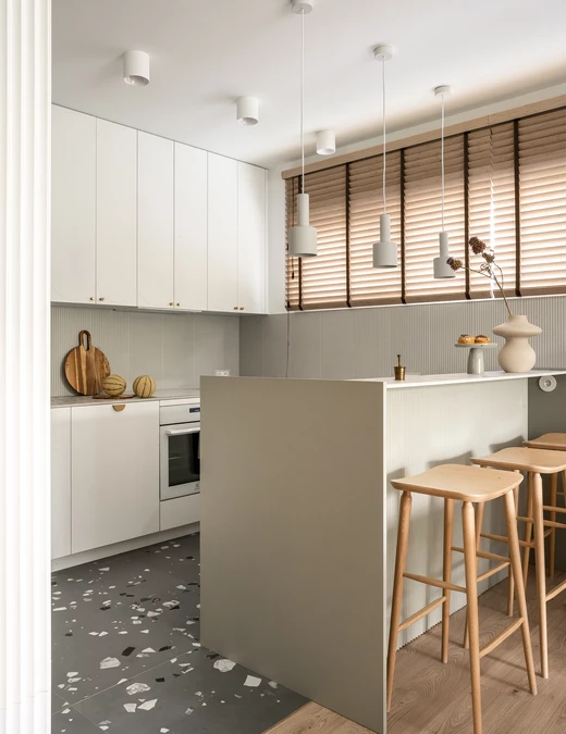 Bazą aranżacji jest połączenie trzech kolorów – zieleni, różu i błękitu – które w tym wnętrzu występują w stonowanych odcieniach. Sercem mieszkania jest salon połączony z otwartą kuchnią, którą od części wypoczynkowej oddziela wysoki półwysep. To praktyczne rozwiązanie, dzięki któremu łatwo ukryć kuchenny bałagan. Właścicielom zależało też na wygospodarowaniu wygodnego blatu roboczego oraz dużej ilości miejsca do przechowywania.