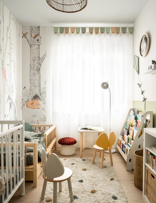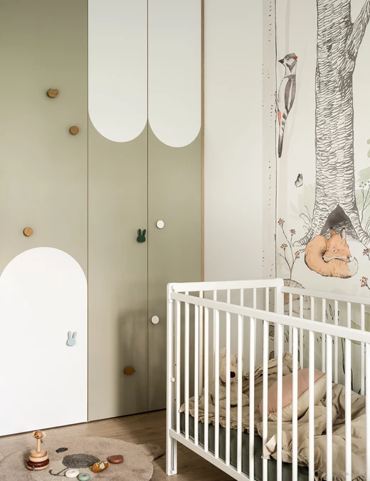Pokój dziecięcy to prawdziwe leśne królestwo! Od tapety, po uchwyty meblowe i dekoracje – wszystko utrzymane jest w motywie przewodnim wnętrza, co jest zasługą inwestorki i mamy najmłodszych domowników. Oprócz łóżeczka i łóżka jest tu też sporo miejsca do zabawy i przechowywania. Zabudowy w pokoju dziecięcym jak i w pozostałych pomieszczeniach wykonała firma Wzór Woodwork.
