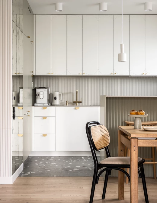 Warto zwrócić uwagę na przełamanie zabudowy różnymi rodzajami frontów szafek – od prostych szarych, po białe z płycinami w formie łuków aż po lustrzane. Z kolei wykończenie wyspy powtarza ryflowany wzór z płytek umieszczonych nad blatem. „Strefą buforową oddzielającą gotowanie od wypoczynku jest duży stół, przy którym znajdzie się miejsce dla dorosłych, a także tych mniejszych lokatorów” - wyjaśnia architektka.