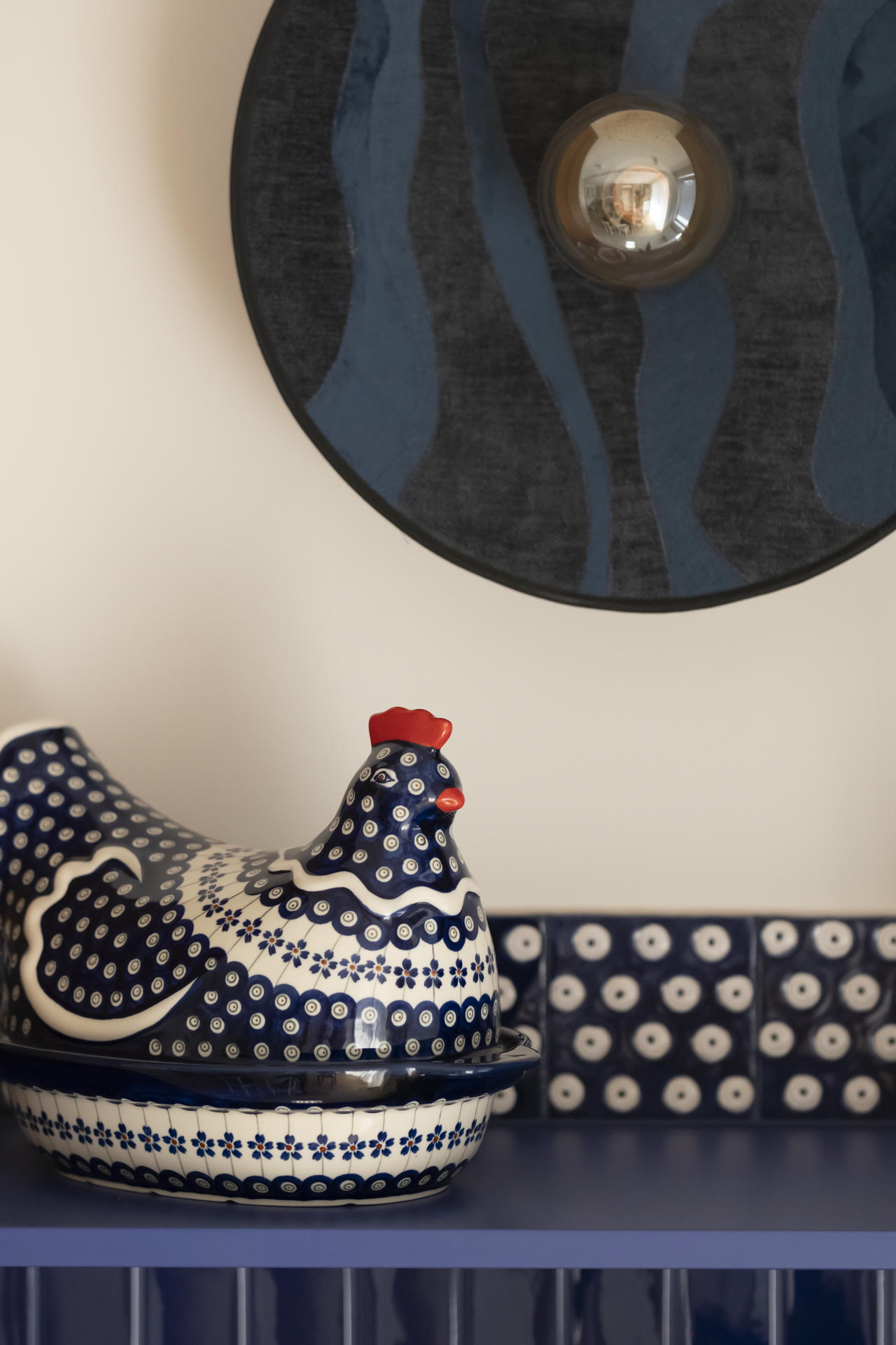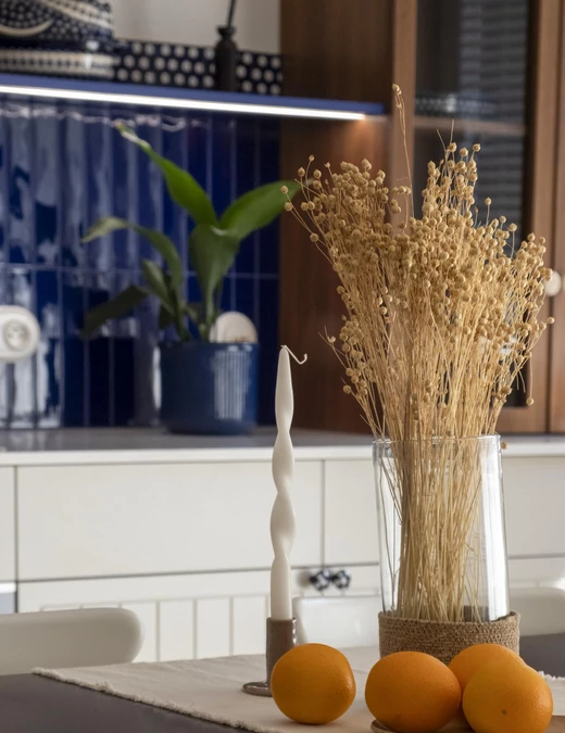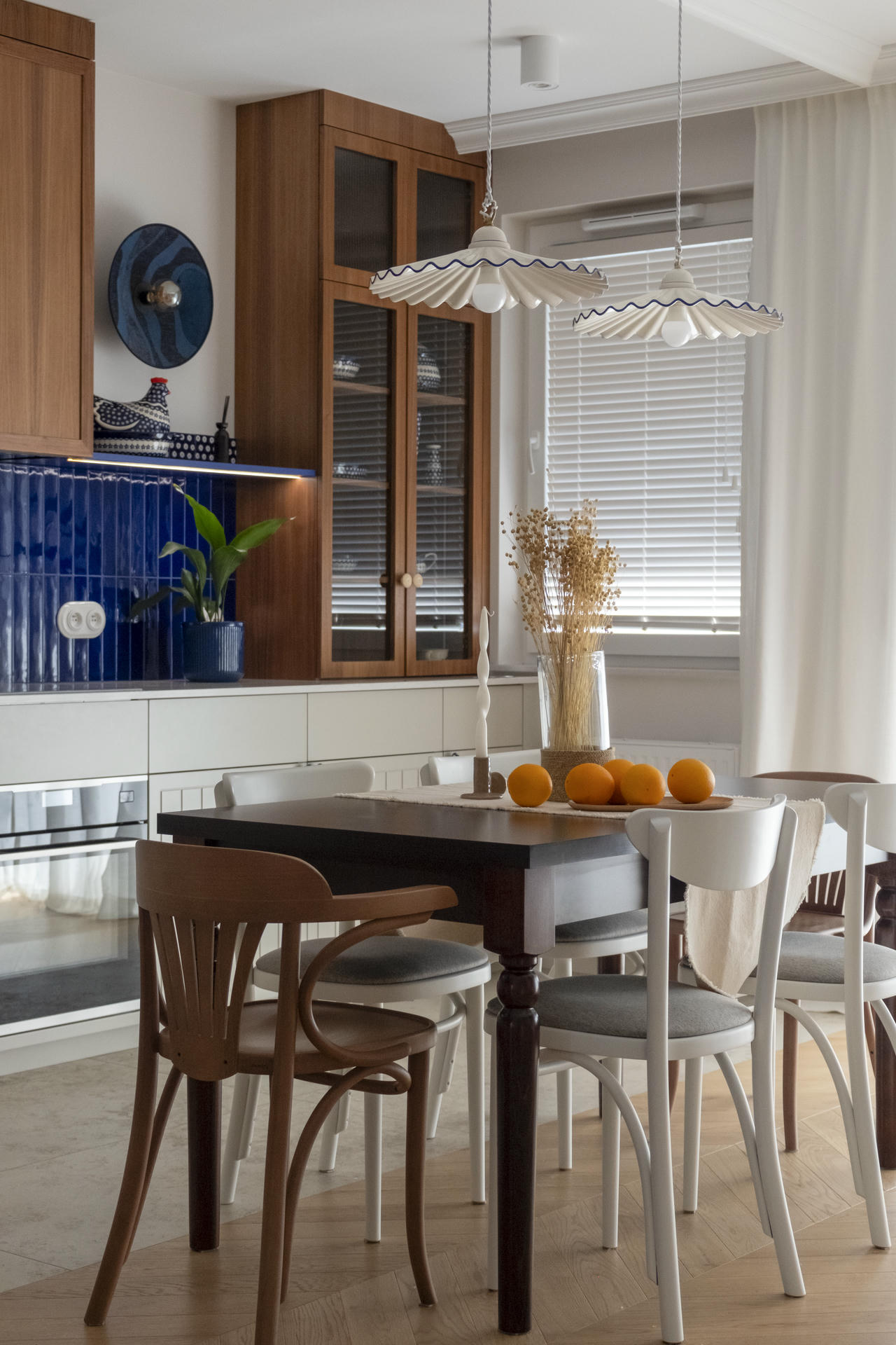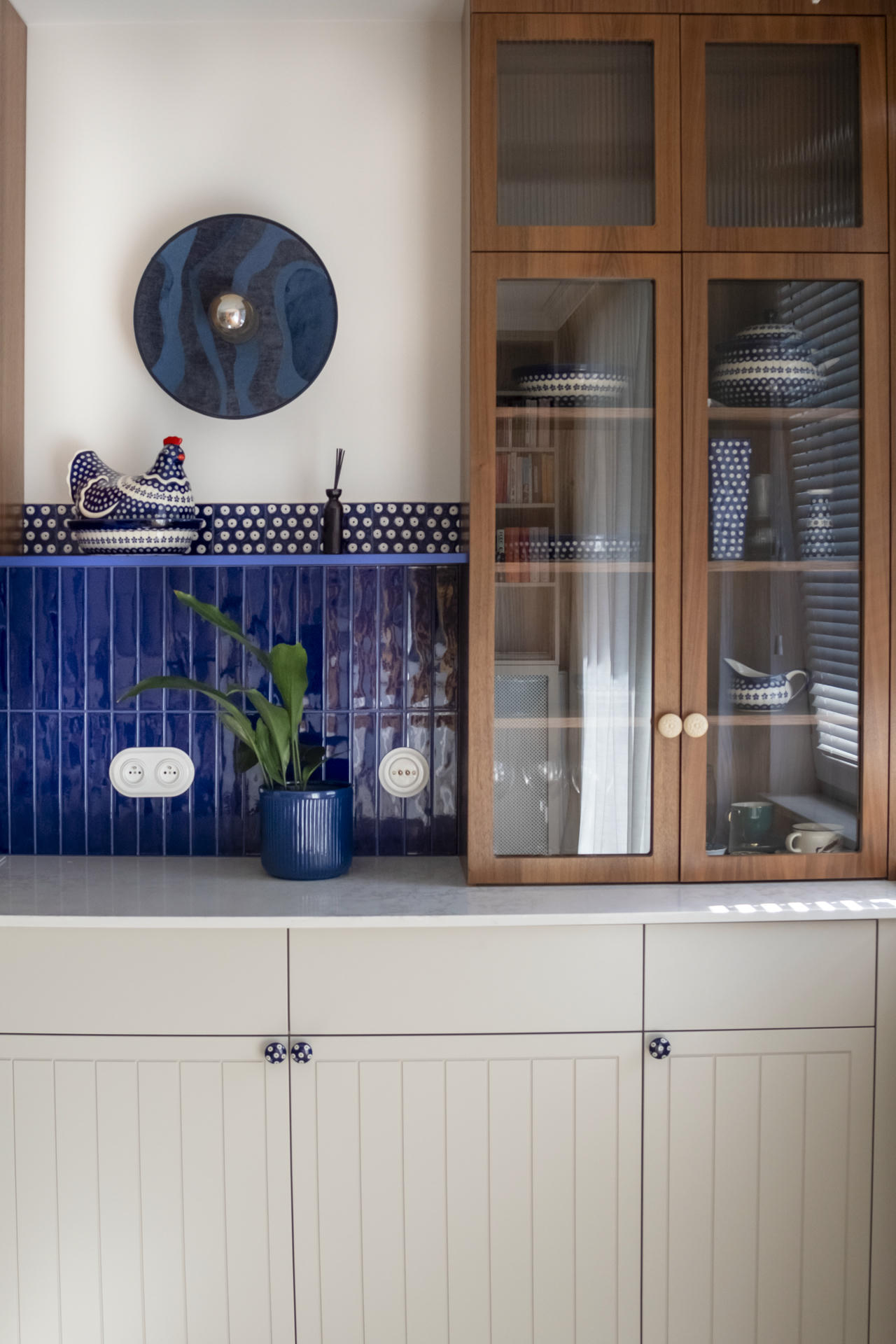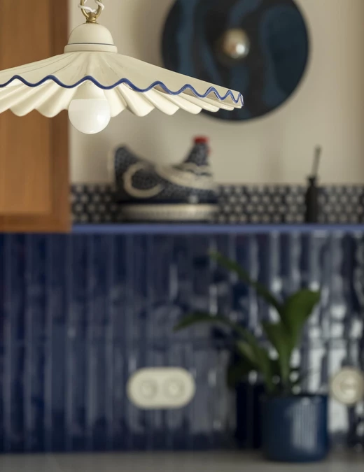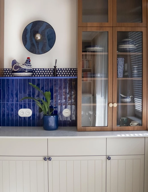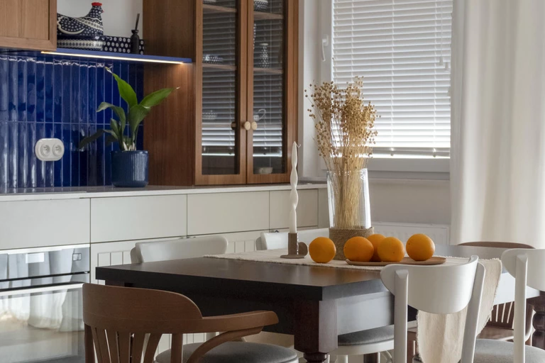 Kuchnia łączy nowoczesną funkcjonalność z ukłonem w stronę przeszłości. Stylizowana witryna oraz ręcznie malowane płytki inspirowane ceramiką z Bolesławca, szczególnie bliską sercu inwestorki, nadają jej osobisty charakter.