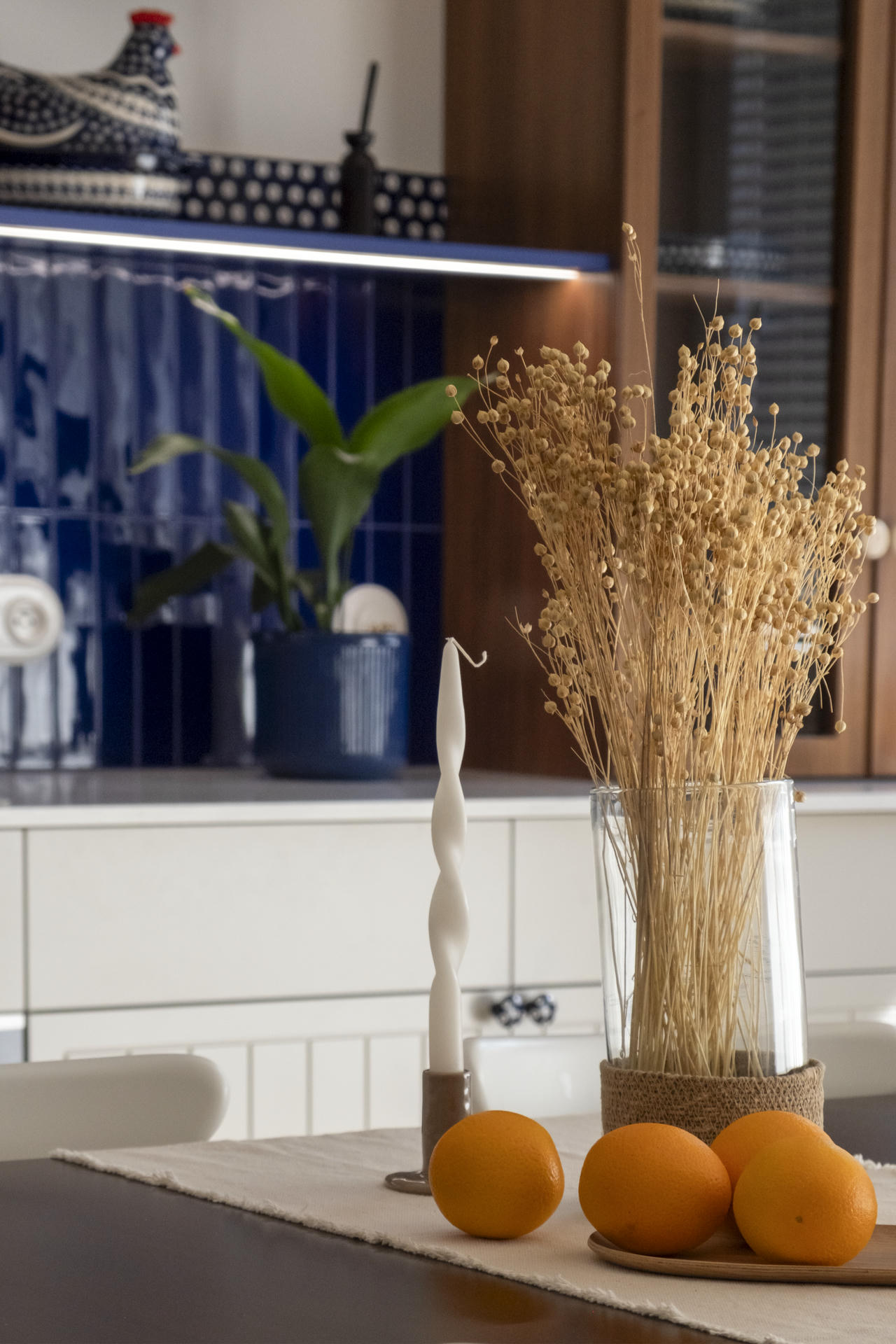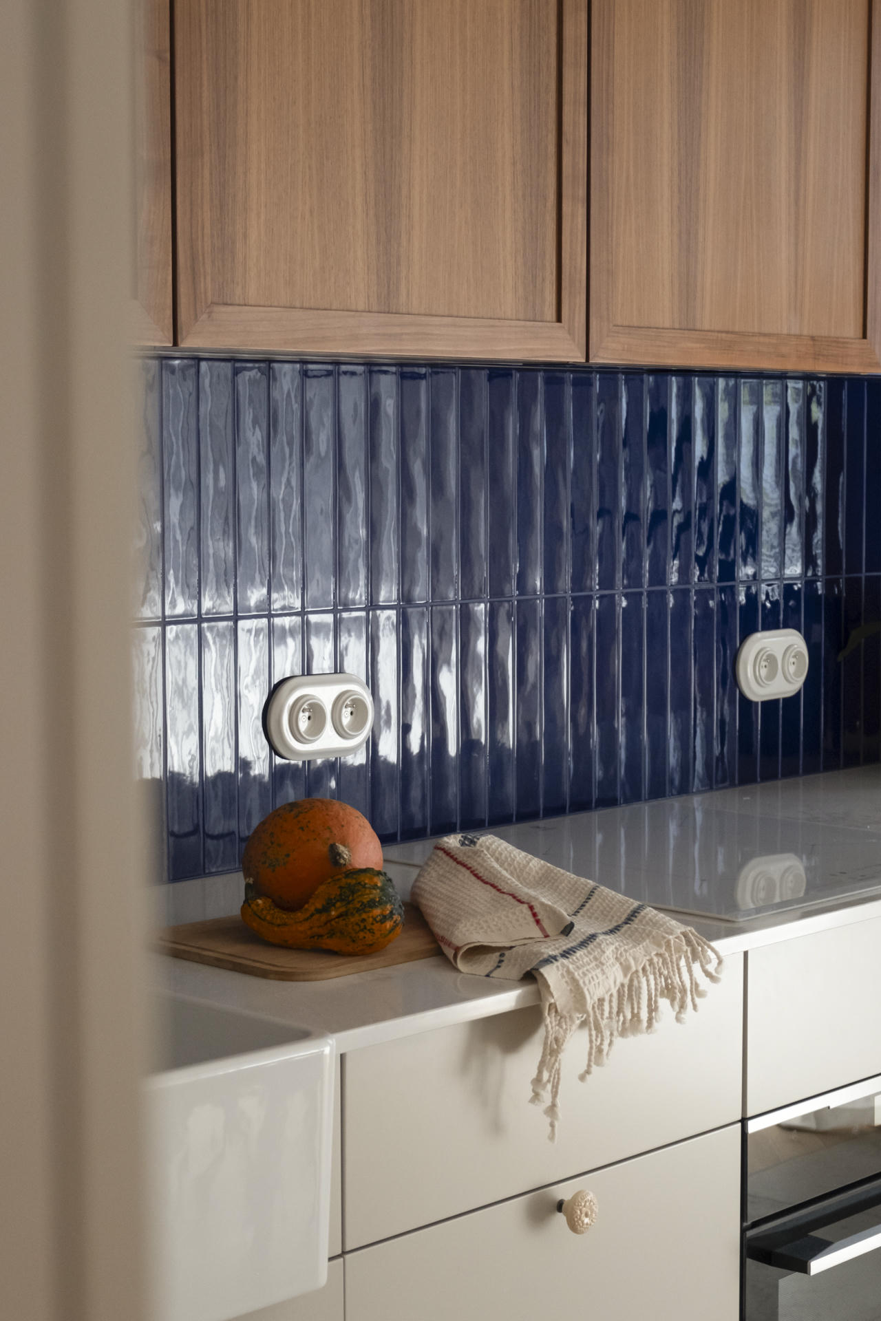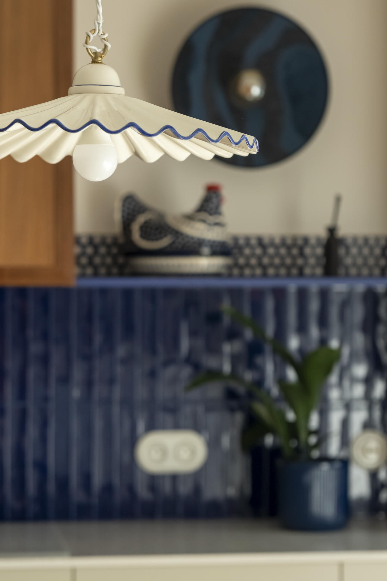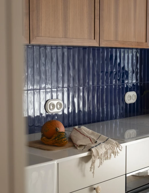 Kuchnia łączy nowoczesną funkcjonalność z ukłonem w stronę przeszłości. Stylizowana witryna oraz ręcznie malowane płytki inspirowane ceramiką z Bolesławca, szczególnie bliską sercu inwestorki, nadają jej osobisty charakter.