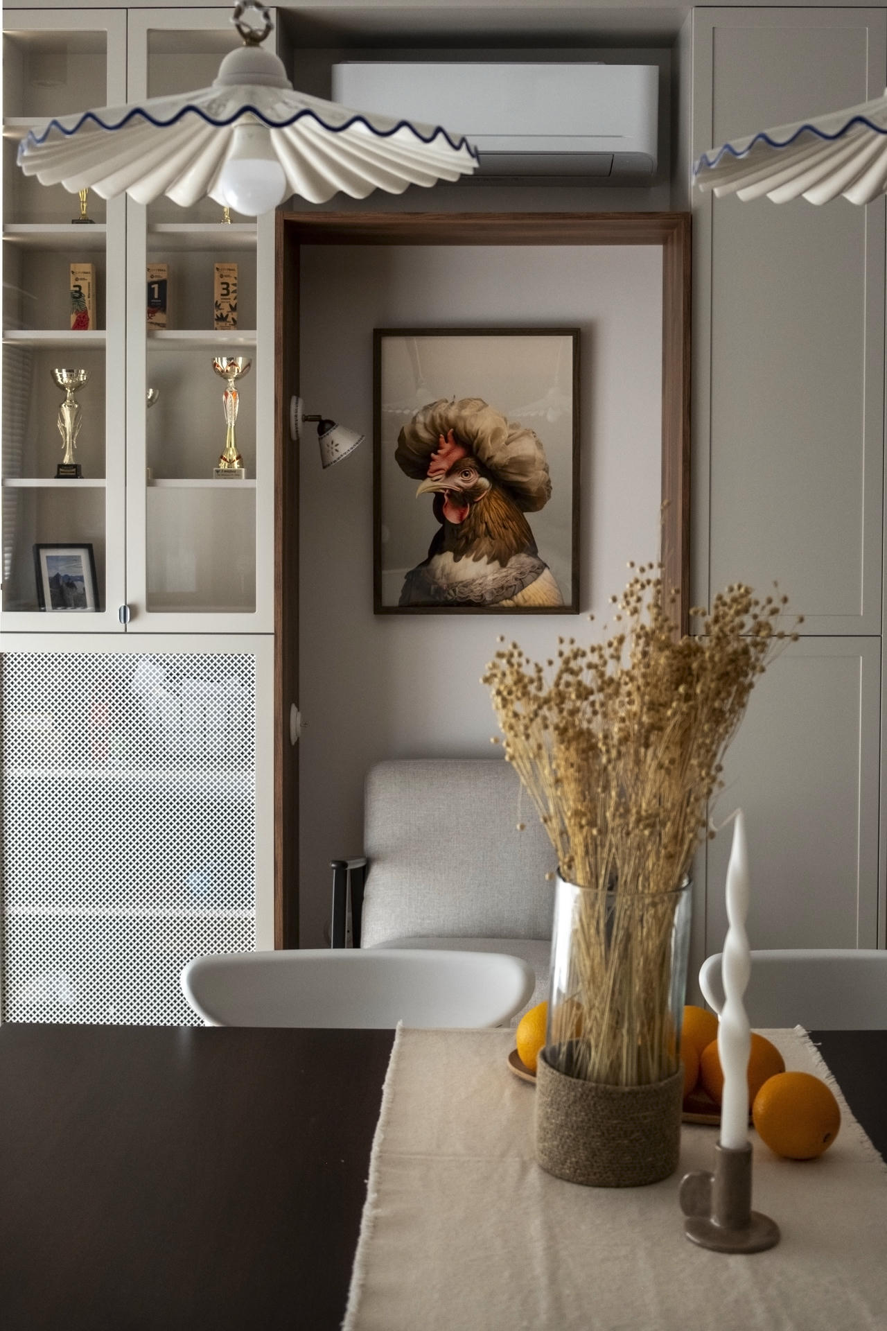 Nieco bardziej żartobliwym elementem, który przewija się w mieszkaniu, jest kura. Pojawia się m.in. na autorskim plakacie zaprojektowanym przez ACH!studio, zdobiącym kącik czytelniczy.