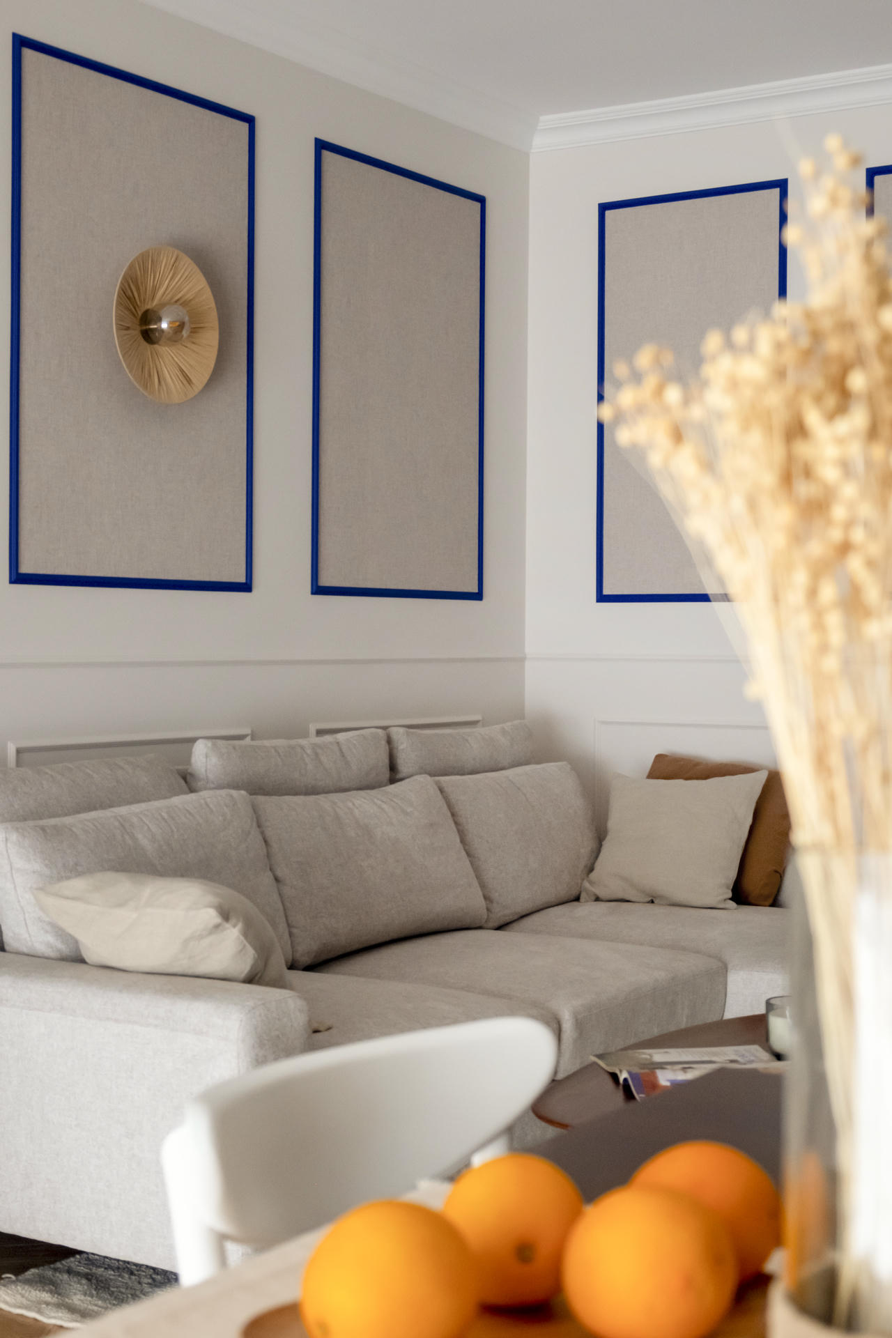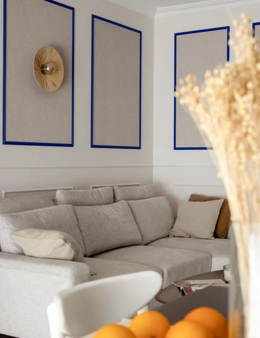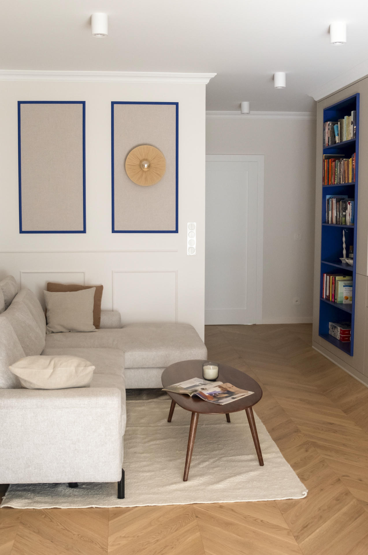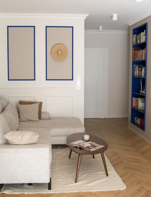 Delikatna sztukateria zdobi ściany korytarza, pełniąc jednocześnie funkcję praktyczną, ponieważ maskuje wejście do głównej łazienki. Korytarz prowadzi do serca apartamentu, czyli strefy dziennej, gdzie centralnym elementem jest biblioteczka we wnęce, utrzymana w intensywnym, kobaltowym kolorze.