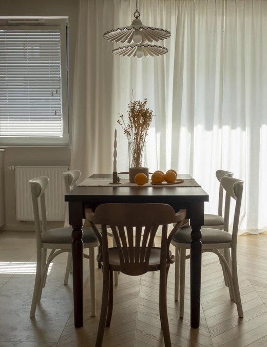 W salonie połączonym z jadalnią i aneksem kuchennym sercem stał się stylizowany stół z rzeźbionymi nogami. Zaprojektowano go z myślą o wspólnych spotkaniach, długich rozmowach i domowym cieple. Całość dopełniają ceramiczne lampy o formie przypominającej miękko drapowaną tkaninę.