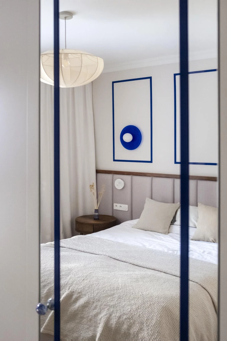 Sypialnia stała się przeciwwagą dla wyrazistej strefy dziennej. Utrzymana w ciepłej palecie beży, z miękkim wezgłowiem, delikatnymi tkaninami zasłon i dekoracyjnym żyrandolem, tworzy atmosferę sprzyjającą wyciszeniu po długim dniu.