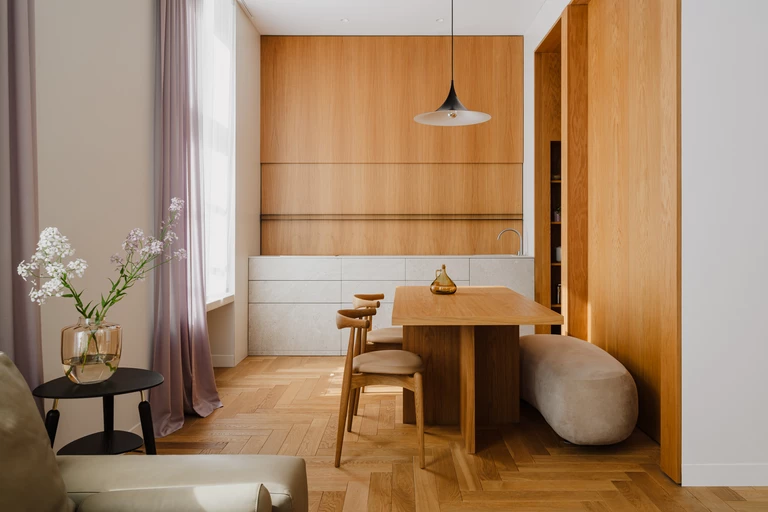 Architektka konsekwentnie stosuje delikatną, stonowaną paletę barw - złamaną biel na ścianach, lawendowy kolor na zasłonach czy jasny beż trawertynowych parapetów. W mieszkaniu dominuje naturalne drewno dębowe, z którego wykonano parkiet, okładziny ścienne i meble. Dzięki niemu wnętrze jest bardzo spójne. „Rysunek drewna zachęca do dotyku frontów, mebli, okładzin ściennych” - wyjaśnia architektka.