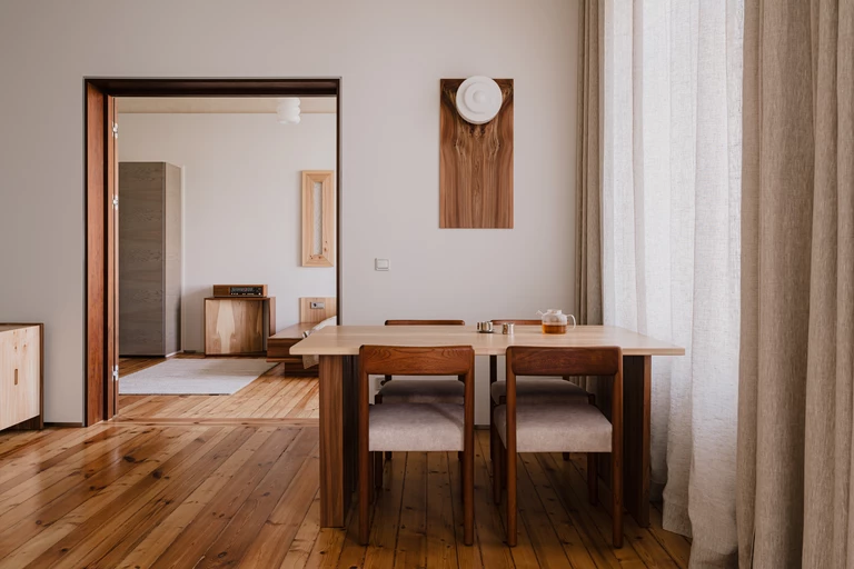 Drewno jest dominującym materiałem we wnętrzu. Dzięki niemu mieszkanie jest przytulne i ciepłe w odbiorze. Architekci z pracowni rys.studio bawią się fakturą drewna i jego usłojeniem, czyniąc z niego nie tylko materiał wykończeniowy, ale i wnętrzarski detal. We wnętrzu zastosowano kilka typów forniru: wiąz jasny i ciemny, orzech amerykański oraz dąb. Architektom udało się uratować starą podłogę z sosnowych desek, to jeden z nielicznych świadków historii tego wnętrza.