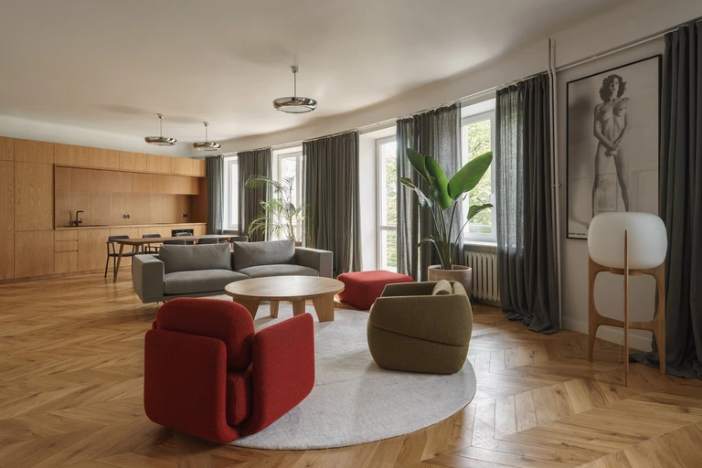 Oprócz tego jednym z głównych założeń projektu było swobodne nawiązanie do historycznego charakteru mieszkania. Z tego względu w przestrzeni swoje miejsce znalazły meble i akcesoria vintage, które zostały odnowione przez pracownię Loft Kolasiński. Wyjątkowym detalem wyposażenia mieszkania są także pochodzące z lat sześćdziesiątych, poddane specjalistycznej renowacji fotele.
