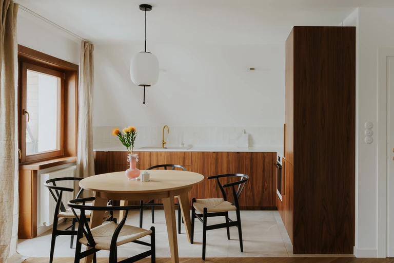 Kuchnię od części wypoczynkowej umownie oddziela kącik jadalniany. Przy okrągłym stole stanął komplet krzeseł „Wishbone” - klasyk dizajnu z 1949 roku projektu Hansa J. Wagnera. Blat oświetla zaś lampa „Epli” od marki Ummo.