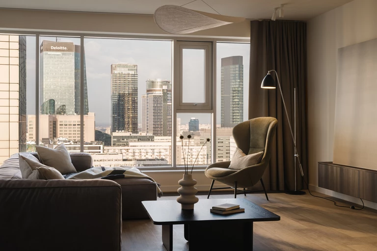 Głównym założeniem projektu wnętrza tego 125-metrowego apartamentu było wykreowanie przestrzeni, która nie konkurowałaby z zachwycającym widokiem na miasto, a raczej stanowiła jego dopełnienie.