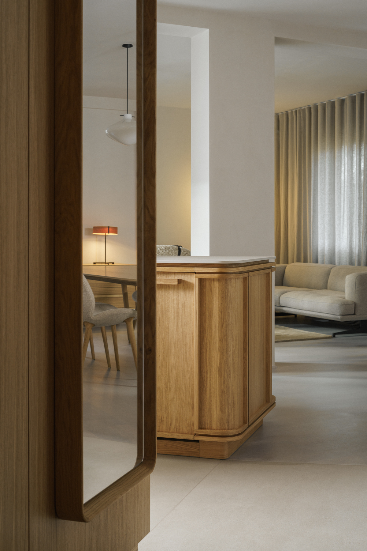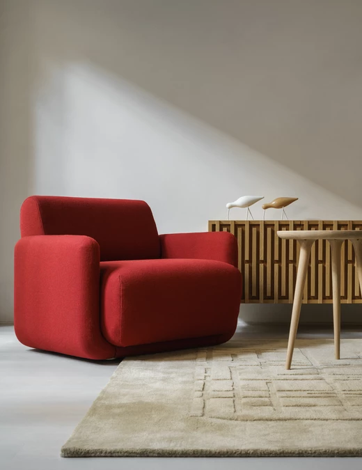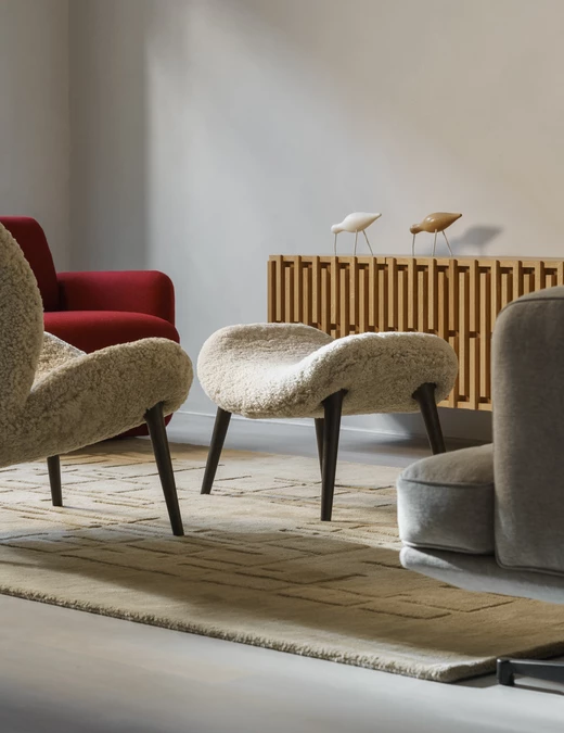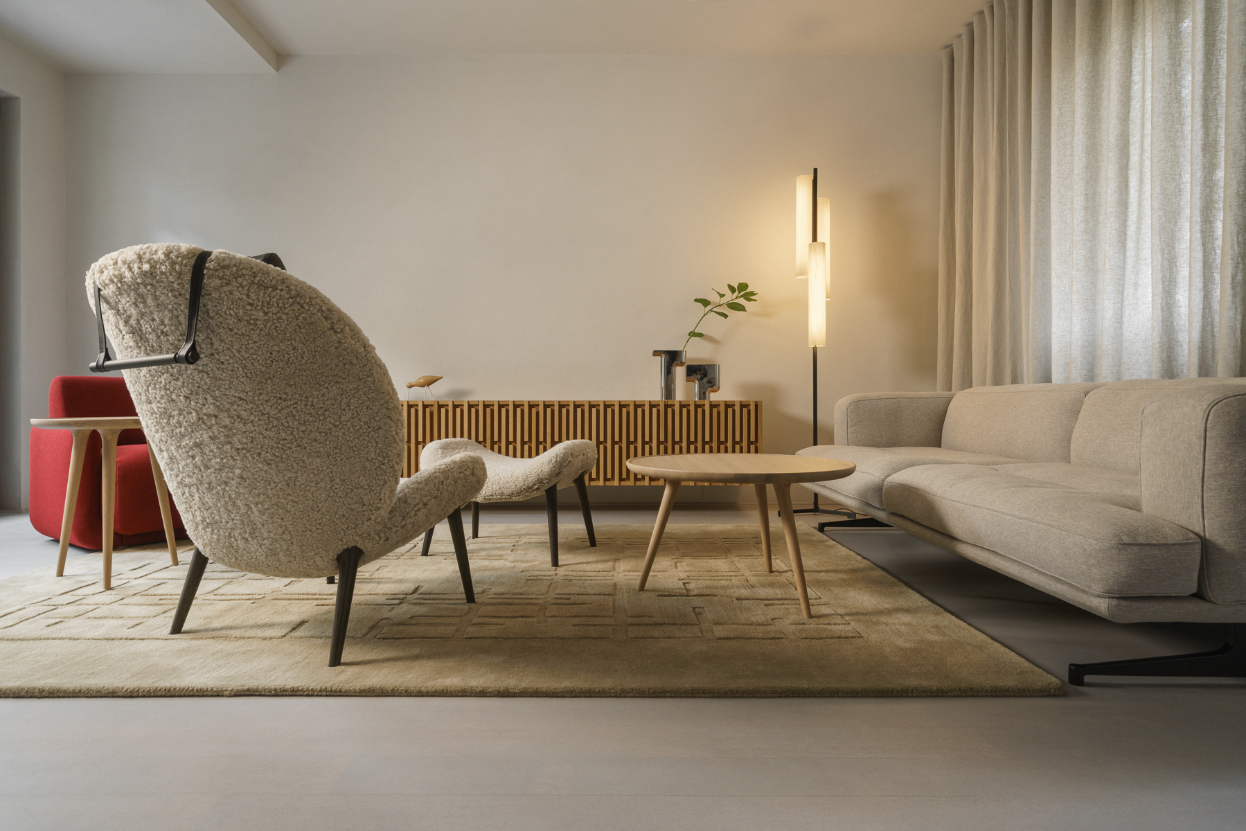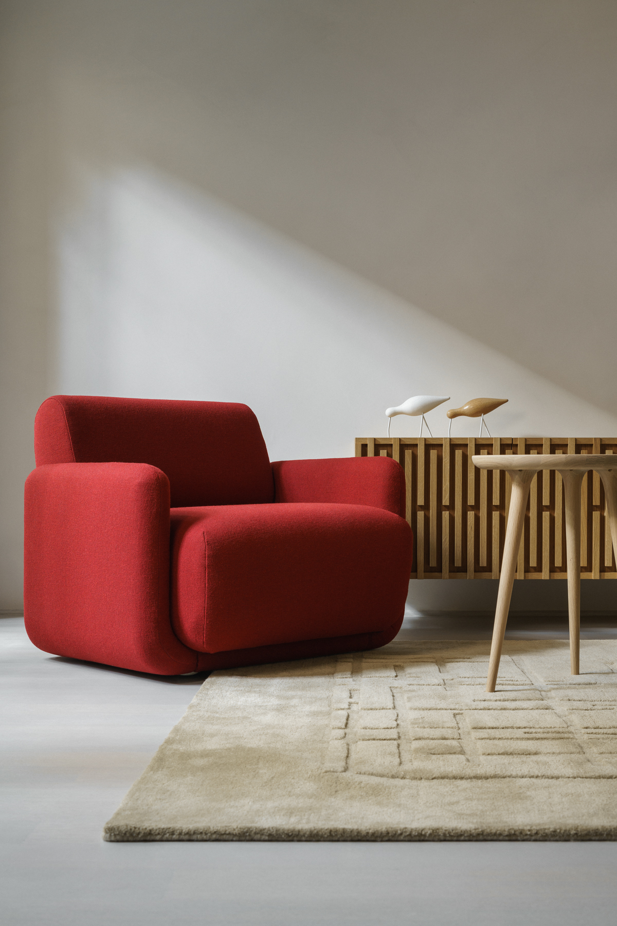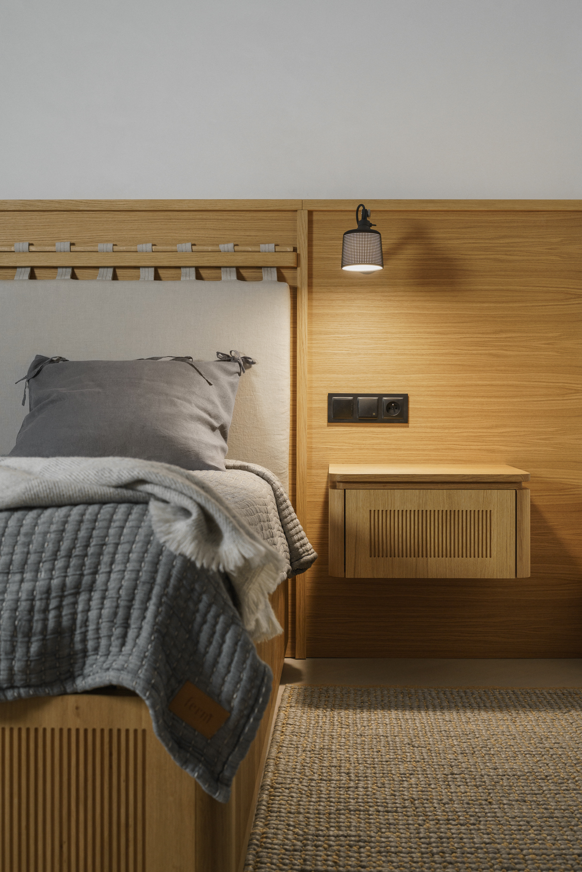 W projekcie pojawił się także dywan od studia Loft Kolasiński zaprojektowany dla duńskiej marki Massimo Copenhagen (kolekcja Symmetry), który subtelnie porządkuje przestrzeń i podkreśla jej spokojny, minimalistyczny rytm.