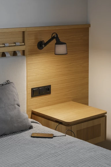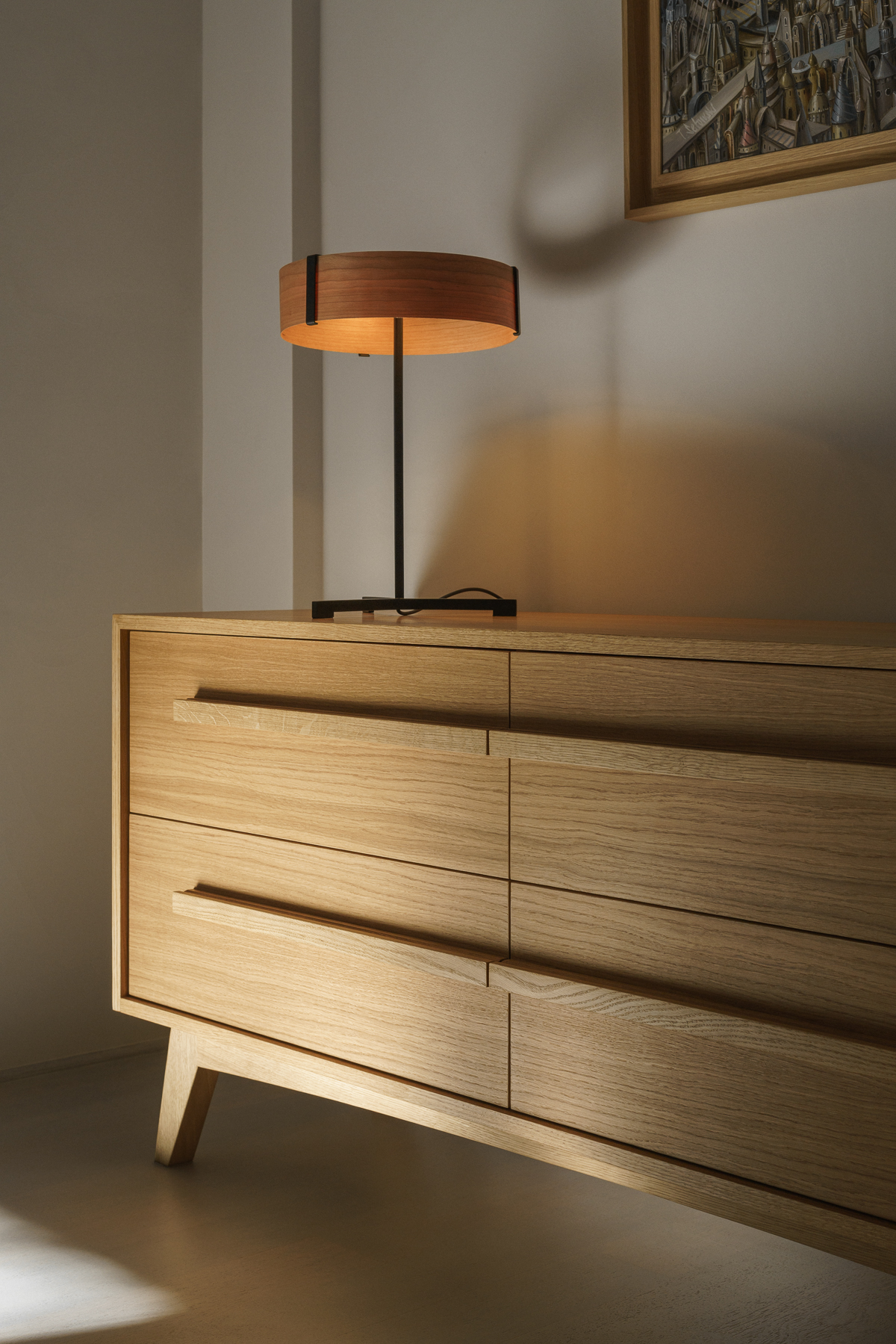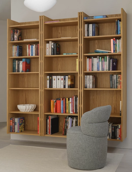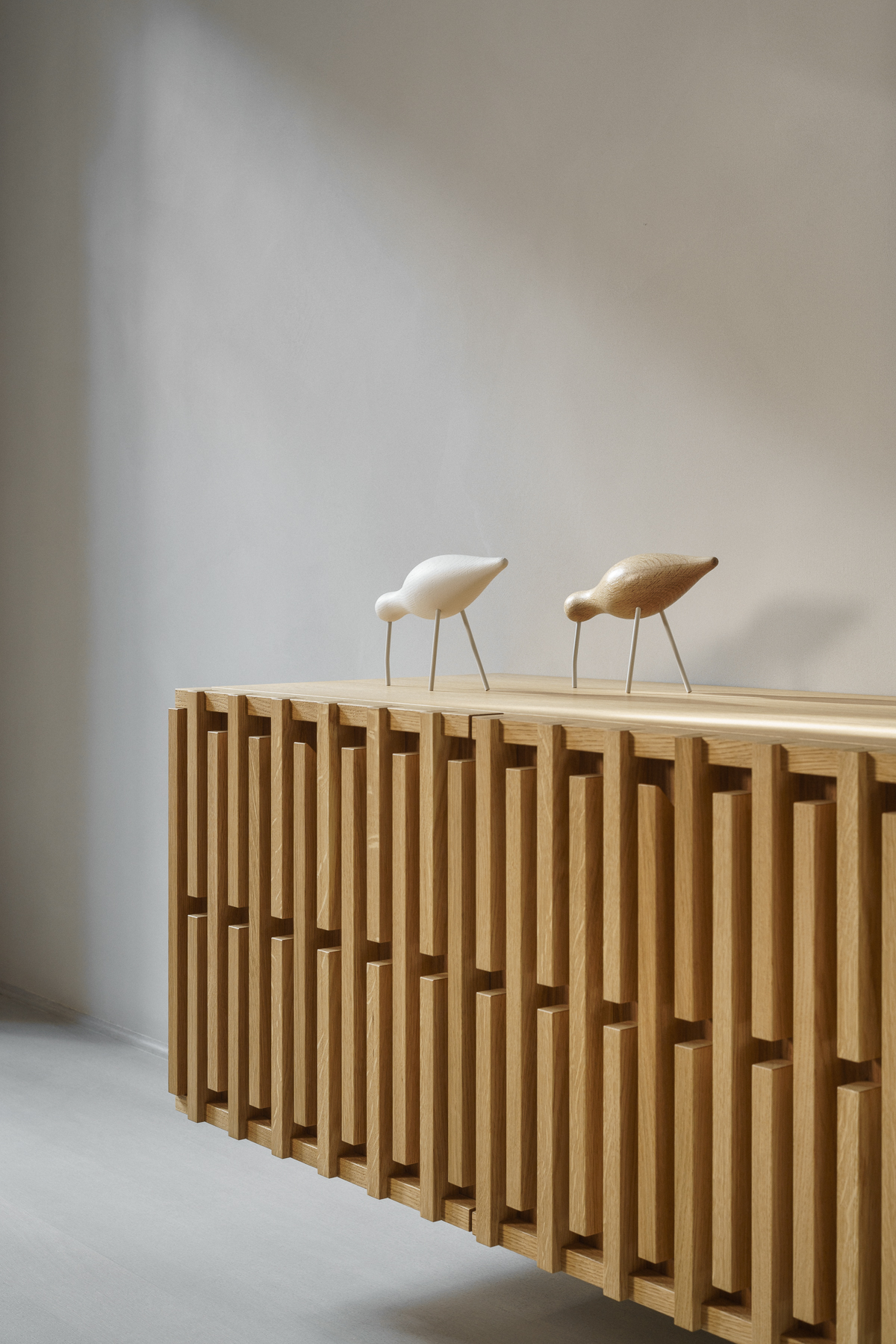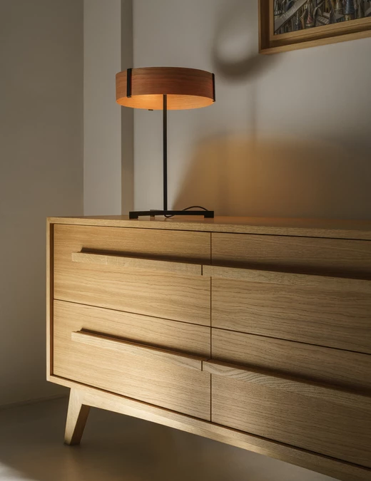 Wśród autorskich mebli znalazły się komody, biblioteka, garderoba, a także komplety mebli do sypialni, kuchni i łazienek, dzięki czemu całe mieszkanie zachowuje spójny charakter.