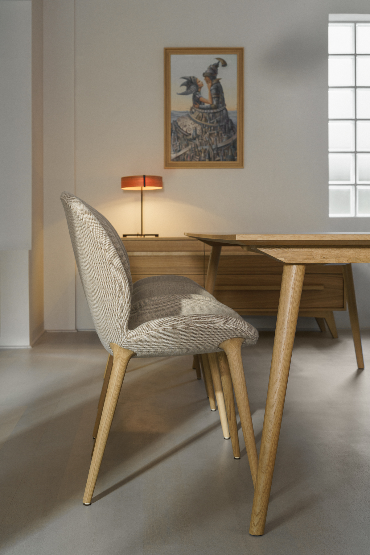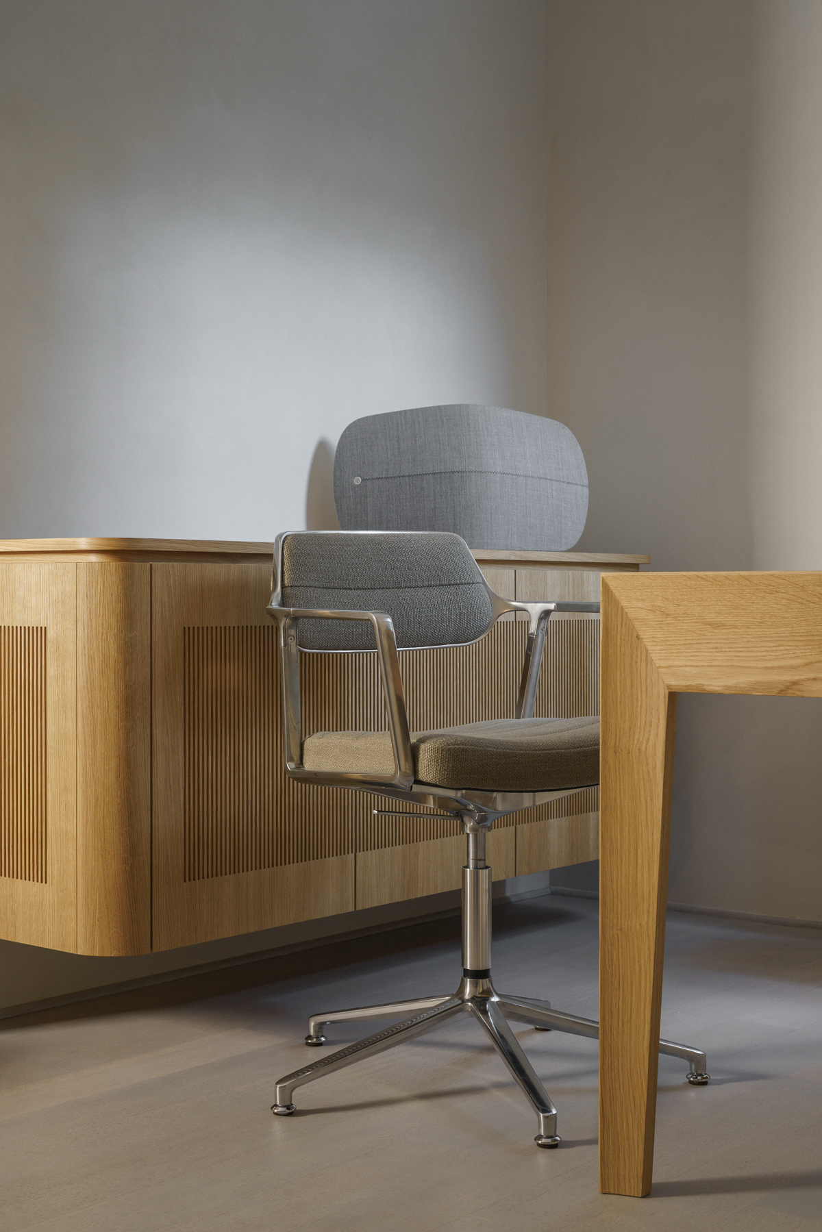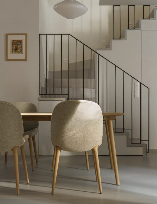Jednym z najbardziej charakterystycznych elementów we wnętrzu jest wyjątkowy fotel z lat 70. Został on poddany renowacji stolarskiej i tapicerskiej, a teraz przełamuje współczesny charakter projektu i wprowadza do niego warstwę historyczną.