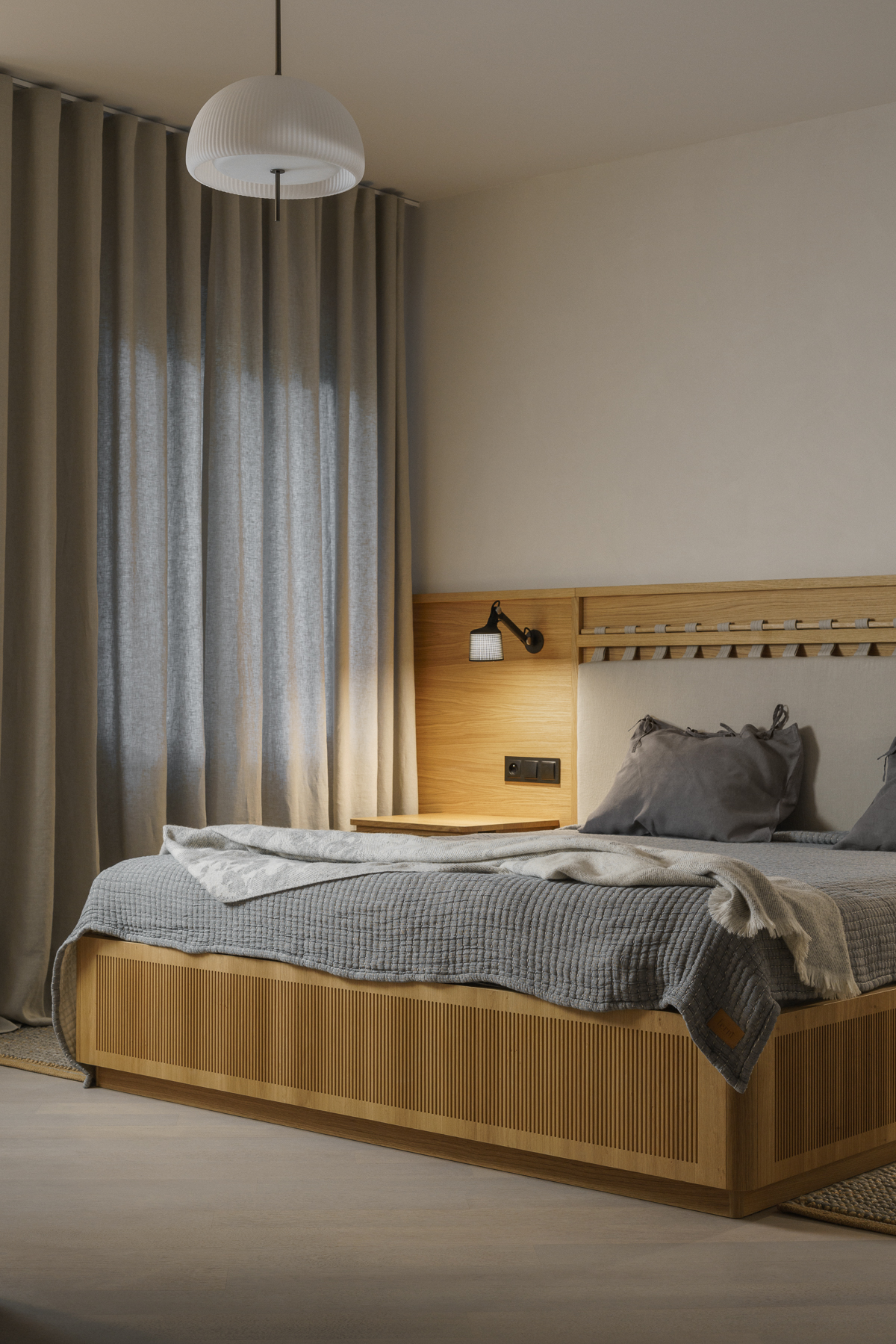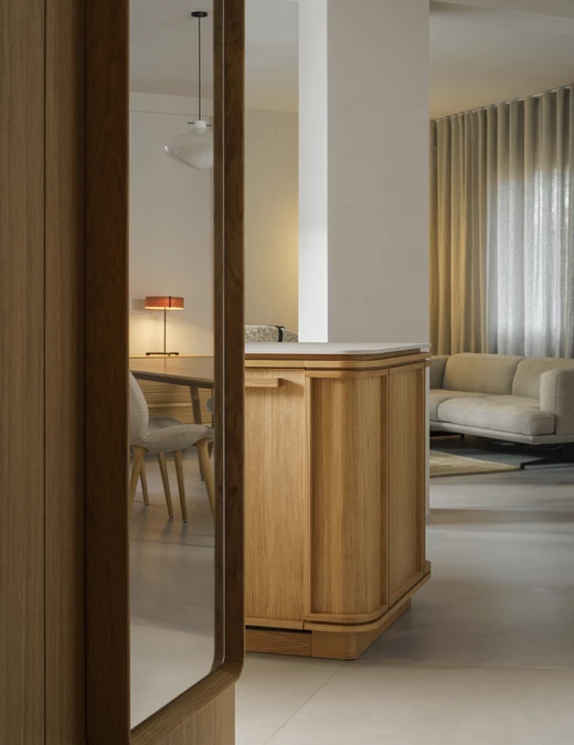 Projekt objął generalny remont całej przestrzeni, liczącej 171 m2. W mieszkaniu królują teraz drewno, len i wełna, bktóre budują ciepłą, naturalną i niemal kojącą bazę dla codziennego życia. Drewniane meble i dodatki zostały zaprojektowane przez Studio Loft Kolasiński – podobnie jak stalowa stolarka oraz betonowa umywalka w jednej z trzech łazienek.