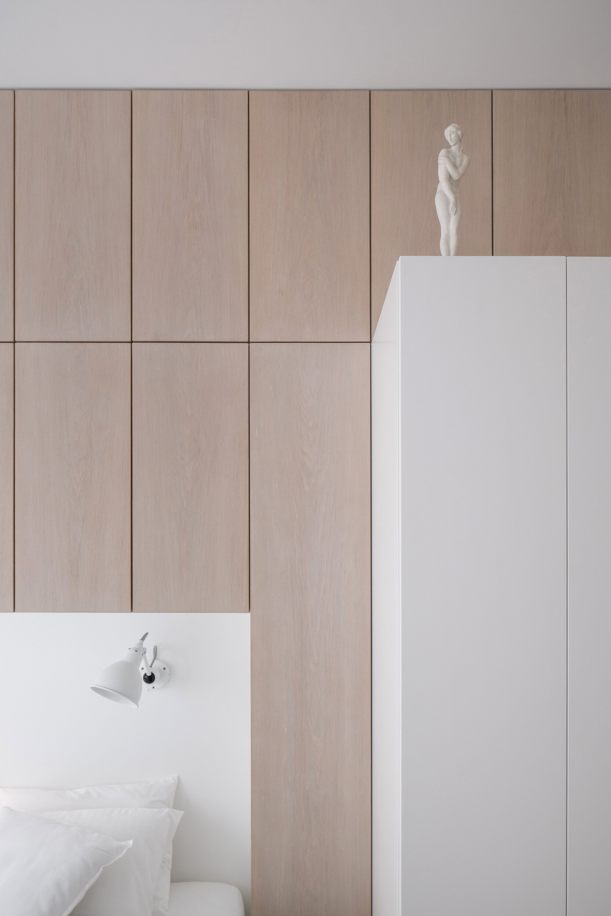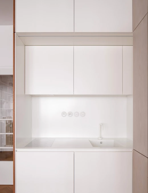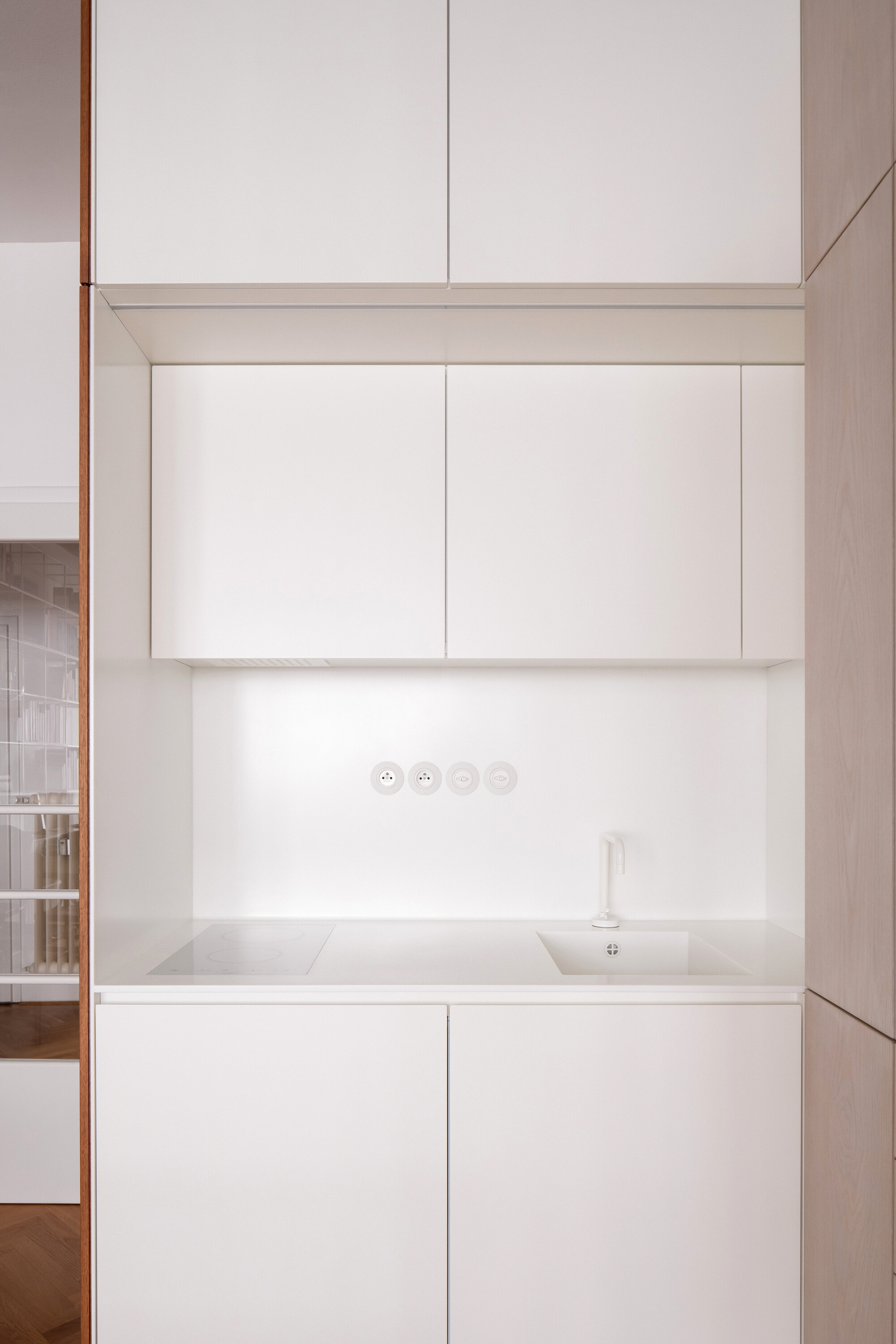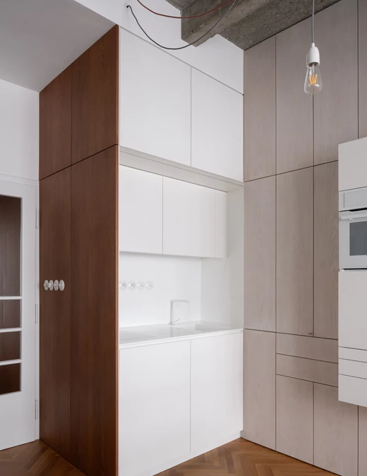 Zmiana układu polegała głównie na wykorzystaniu dawnej kuchni i całkowitym wyburzeniu pierwotnej spiżarni oraz łazienki, które zastąpiono nowym blokiem meblowym mieszczącym schowki, przestronną łazienkę i część kuchni. Został on wykonany z barwionego forniru dębowego i białego lakieru.