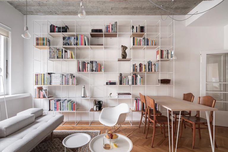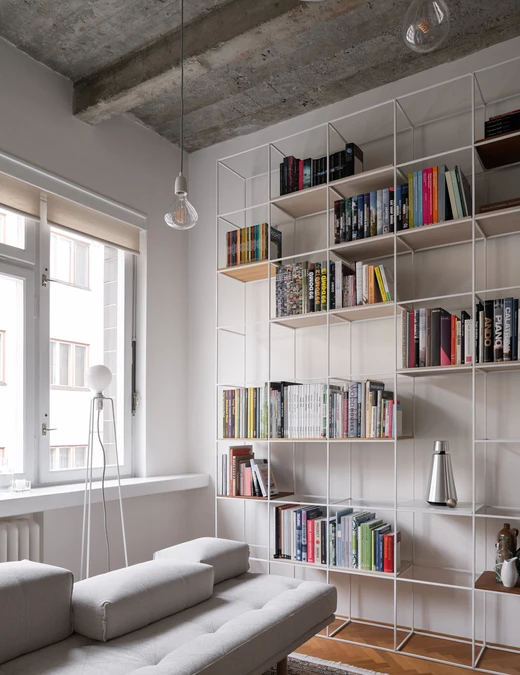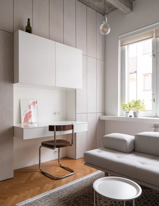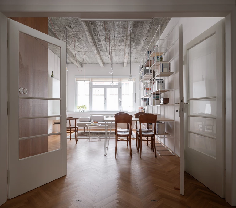 Wystrój mieszkania to kolaż osobistych wspomnień i nowoczesnego designu. W jadalni stoją cztery krzesła Thonet pochodzące z domu pradziadków architekta, obok nich fotel Thonet i lampa Anýž z lat 30. Pojawia się też rurkowy fotel Ez12, zaprojektowany w 1930 roku przez Karela Orta dla firmy Gottwald, oraz rzeźby Jaroslava Horejca – artysty związanego z rodziną Cenka. Współczesne meble, m.in. sofa Fusion projektu studia Nendo, tworzą z nimi harmonijną całość.