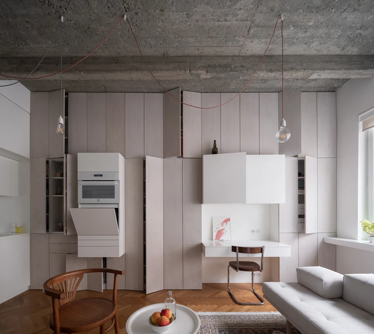 W sercu praskiego Nowego Miasta, w budynku z końca lat 30., architekt Martin Cenek przeprowadził renowację swojego dwupokojowego mieszkania. Projekt, zatytułowany przez autora jako „Functionalist Apartment with Pink Piggy”, to hołd dla modernistycznej architektury międzywojennej.