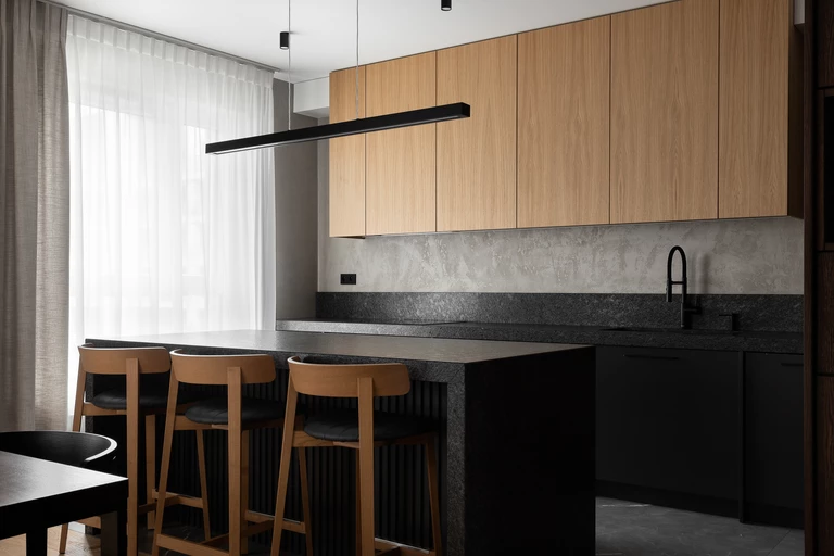Przestrzeń mieszkania uzupełnia kuchnia z symetryczną zabudową i wyspą pośrodku. Kompozycja dwóch kolorów, dębu oraz naturalnego kamienia wprowadza porządek i ciepło. Prostą formę i spokojne kolory znajdziemy również w łazienkach, które w ten sposób spełniają wymagania inwestorów. Jedyne kontrastowe elementy to czarne armatury i akcesoria.
