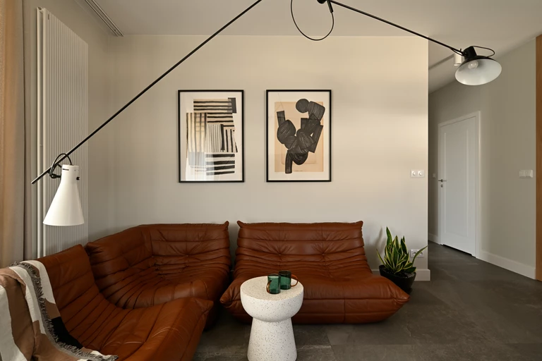 Właściciele od początku wiedzieli, że w mieszkaniu mają pojawić się dwa konkretne elementy: ulubiona orzechowa komoda polskiej marki Tamo, jedyny mebel zabrany z poprzedniego lokum, oraz wymarzony zestaw sof Togo. Dzięki ograniczeniu palety barw, elementy te, ich faktura i detale, mogą grać pierwsze skrzypce. Z kolekcji Tamo wybrane zostały także wybarwione na czarno krzesła z podłokietnikami, zestawione z fornirowanym stołem Gubi. Charakter przestrzeni idealnie uzupełniają grafiki kopenhaskich artystów z Atelier Cph, które pojawiają się w całym wnętrzu.