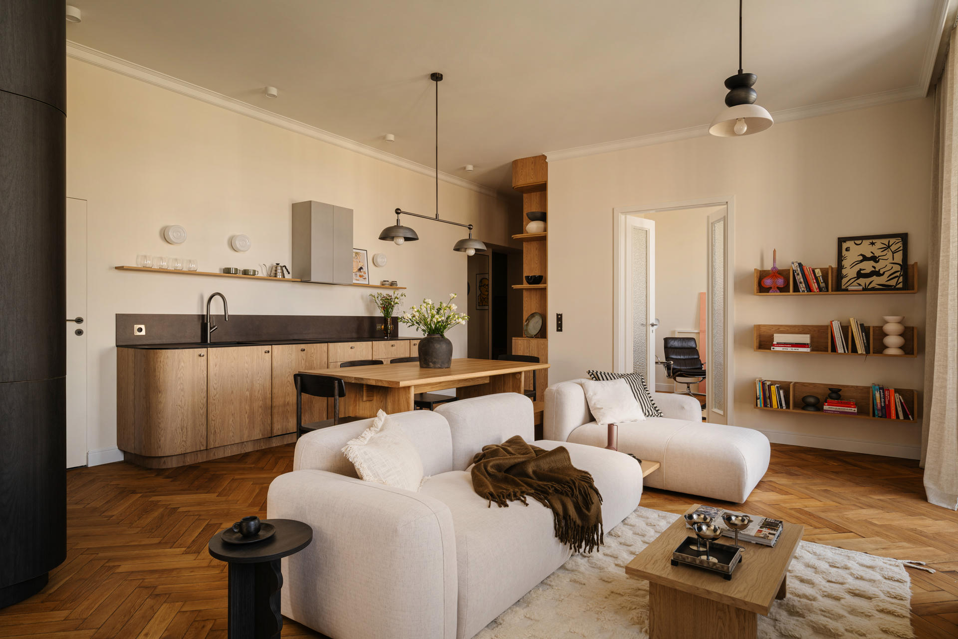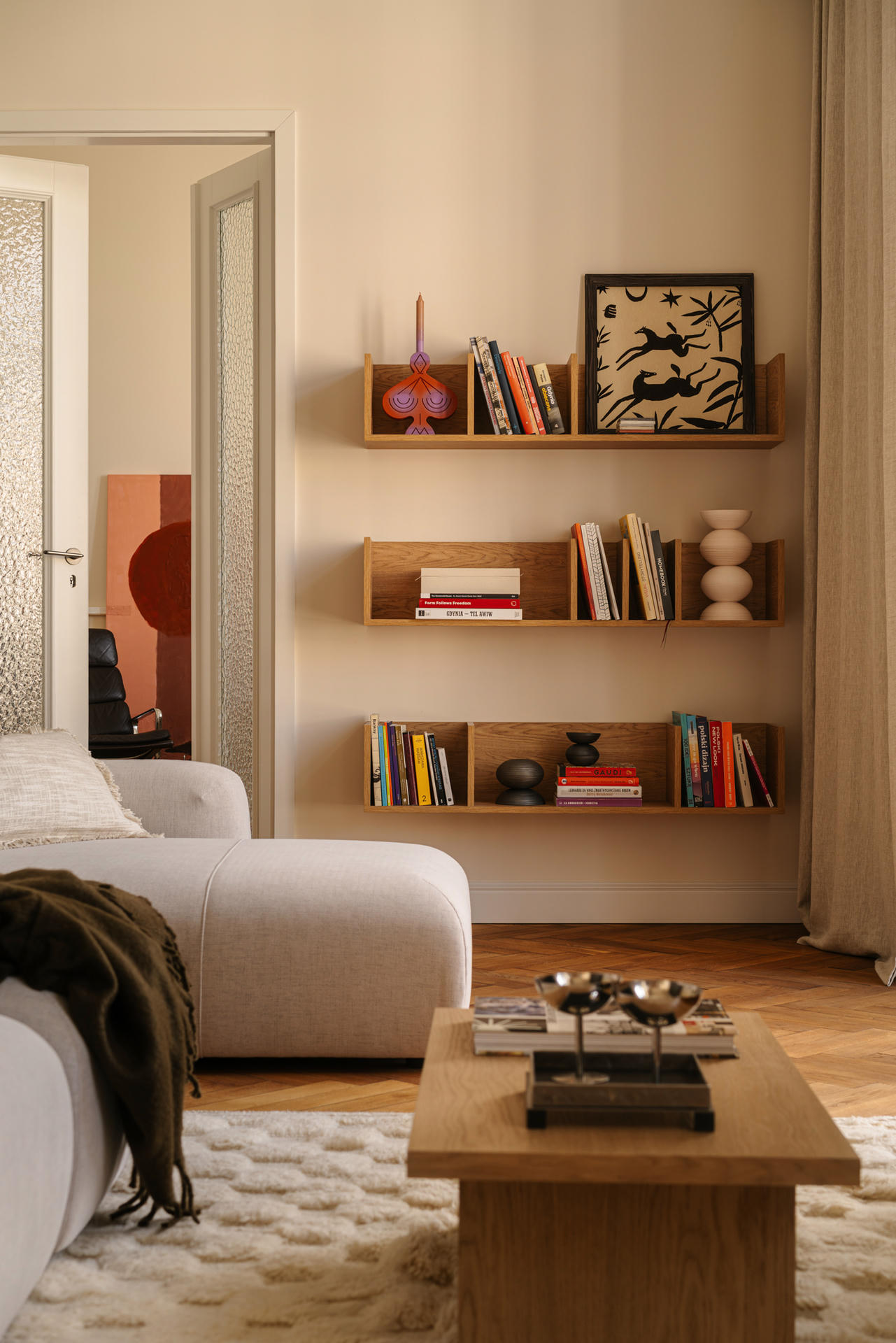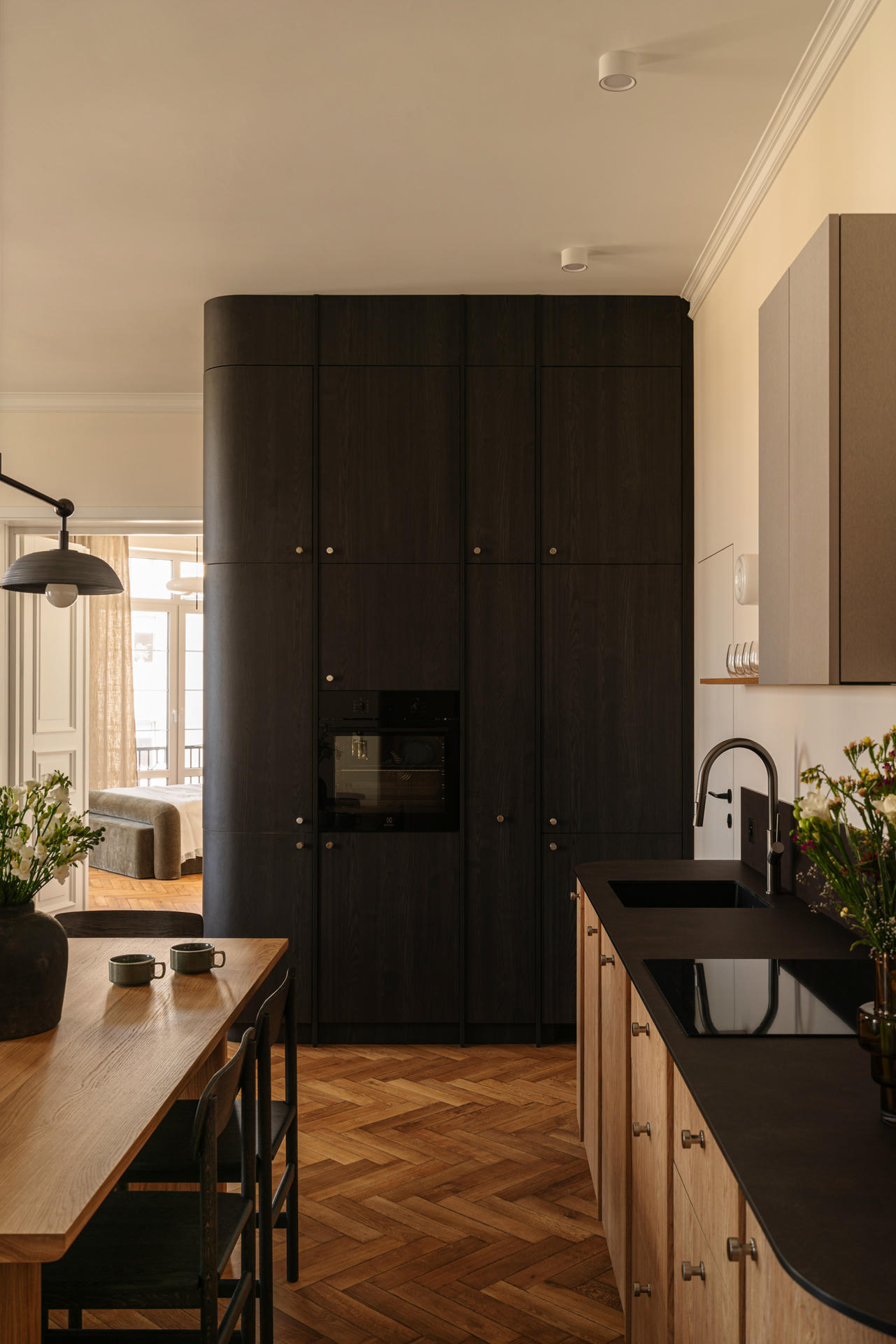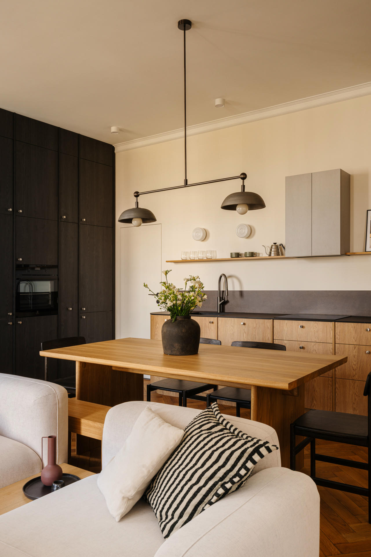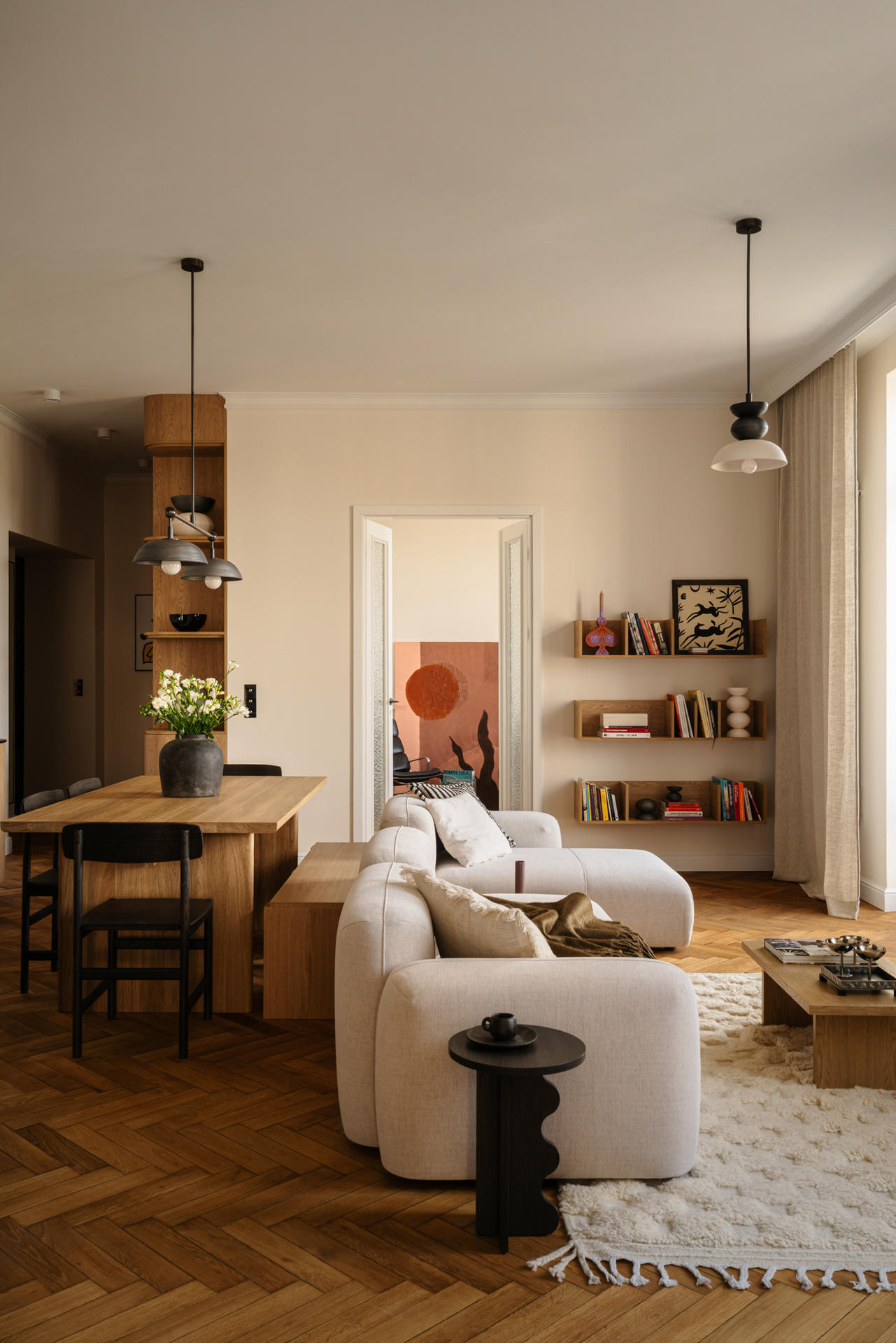 Charakter przestrzeni budują proste formy zestawione z klasycznymi materiałami – drewnem, metalem, szkłem i ceramiką – oraz bogactwem faktur. W witrażach wykorzystano szkło ornamentowe, natomiast lniane zasłony i wełniane dywany wprowadzają przytulną miękkość oraz dodają wizualnej głębi.