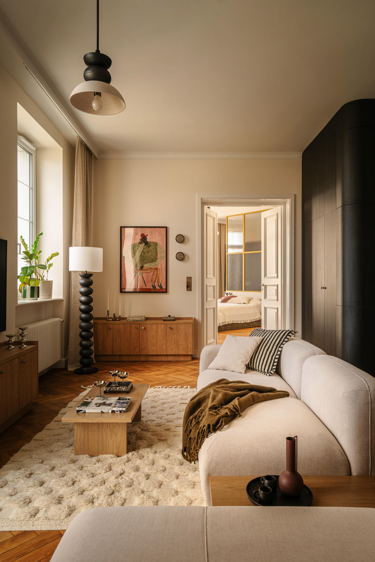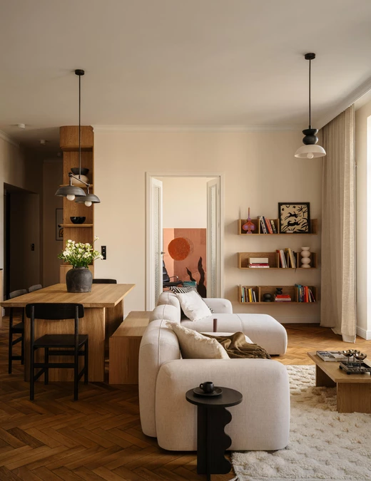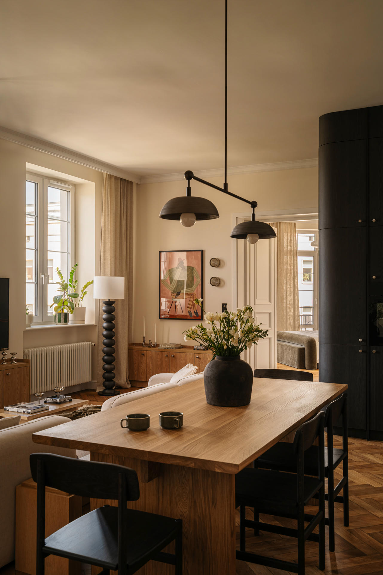 Modernistyczne dziedzictwo, architektura lat 30., nowoczesny sznyt, meble vintage oraz sztuka użytkowa – wszystkie te wątki spotykają się w niemal 100-metrowym mieszkaniu zaprojektowanym przez Justynę Hys-Bochińską z J Creative Studio.
