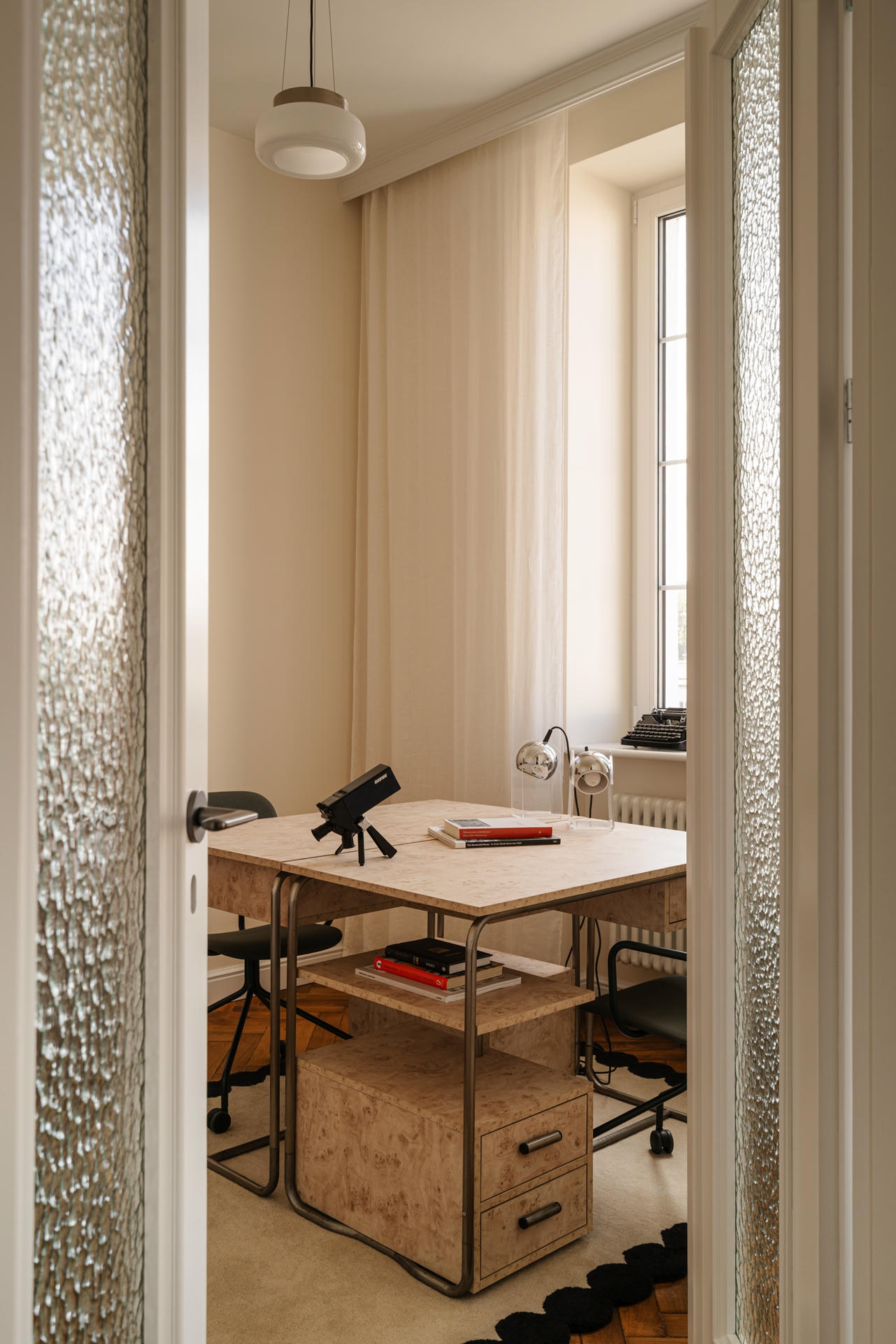 Nowoczesne elementy zostały świadomie skonfrontowane z obiektami vintage – niektóre z nich odrestaurowano specjalnie na potrzeby tego projektu. W przestrzeni pojawiają się dawne biurka lekarskie z zachowanymi oryginalnymi metalowymi stelażami i uchwytami, fotel biurowy Delta Chair marki Wilkhahn z 1970 roku oraz kultowy Soft Pad Chair EA 216 zaprojektowany przez Raya i Charlesa Eamesów dla Herman Miller.