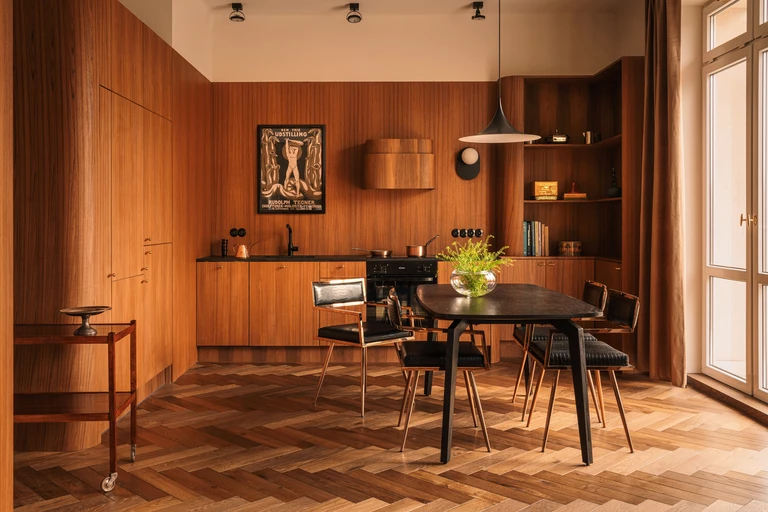 Kuchnia, choć niecentralna, jest sercem mieszkania – od niej zaczęto projekt. Założono minimalizację funkcji kuchennych na rzecz regału na książki oraz ukrytej w zabudowie pralki i przestrzeni do przechowywania. Istotną cechą zabudów są zaoblone narożniki – rozwiązanie podkreślające modernistyczne inspiracje. W kuchni znajdują się meble wybrane przez inwestorów: czarny drewniany stół z geometrycznymi nogami oraz chromowane krzesła z motywem zwierzęcym. Projekt uzupełnia klasyczna lampa Semi Pendant marki Gubi w kolorze czarnym matowym oraz zlokalizowana nad zlewem grafika – plakat wystawy Rudolpha Tegnera.