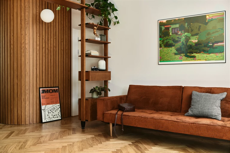 Sercem salonu jest sofa marki Innovation Living o ciepłym, rudym odcieniu. Nad sofą zawisł obraz z pixodelic studio autorstwa Sainer Etam, ulubionego artysty właścicieli mieszkania. Dominujący w dziele kolor zielony to powtarzający się motyw we wnętrzu, który również pojawia się na elewacji budynku. Stojące między kuchnią a salonem krzesła od mdd office mają prosty kształt przypominający krzesła stanowiące umeblowanie biura. Doskonale jednak odnajdują się w przestrzeni, która ujmuje naturalnymi materiałami i kolorami. Wzrok przyciąga także stół jadalniany od G-plan i plakaty Iwony Martynowskiej.
