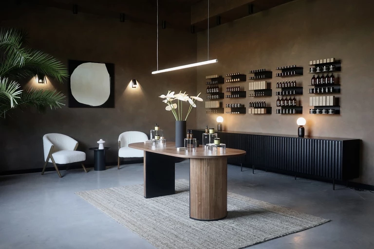 Minimalistyczne opakowania kosmetyków MOKOSH stanowiły punkt wyjścia, stąd brązy i czernie we wnętrzu jako dominująca baza kolorystyczna, podkreślająca tym samym produkty marki.