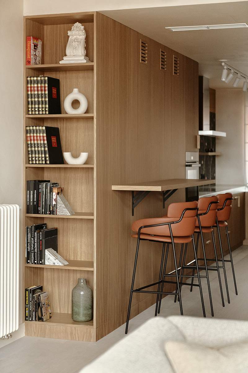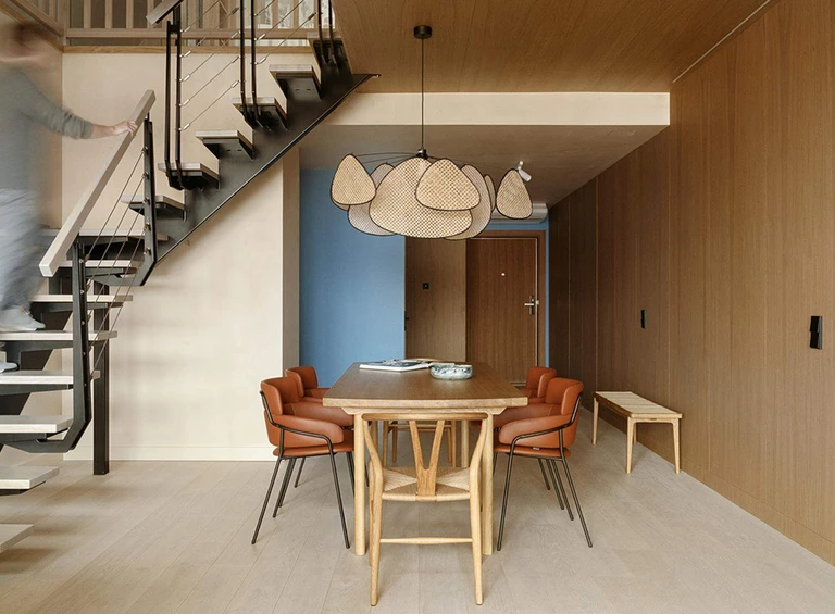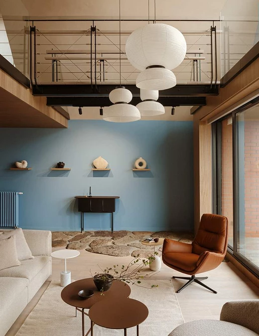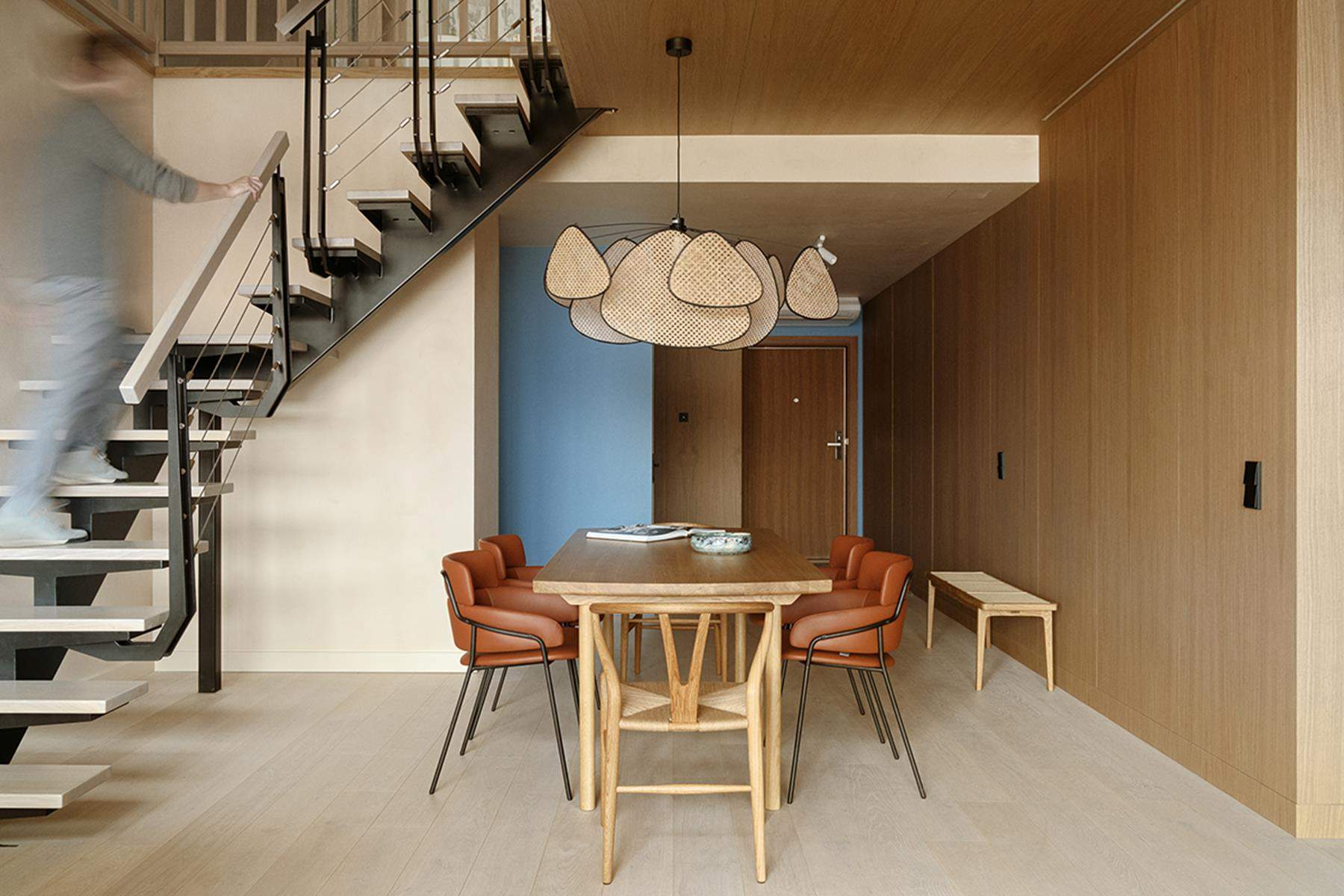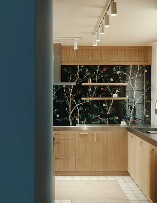 Architekci sięgnęli po stylistykę japandi, która łączy skandynawski pragmatyzm z japońskim minimalizmem. Drewniane powierzchnie, stonowane kolory i naturalne materiały budują bazę, a mocniejsze akcenty, jak błękitna ściana z dopasowanym grzejnikiem czy wzorzysta łazienka, dodają charakteru. Motywy roślinne powracają zarówno w części dziennej, jak i prywatnej, spajając projekt.
