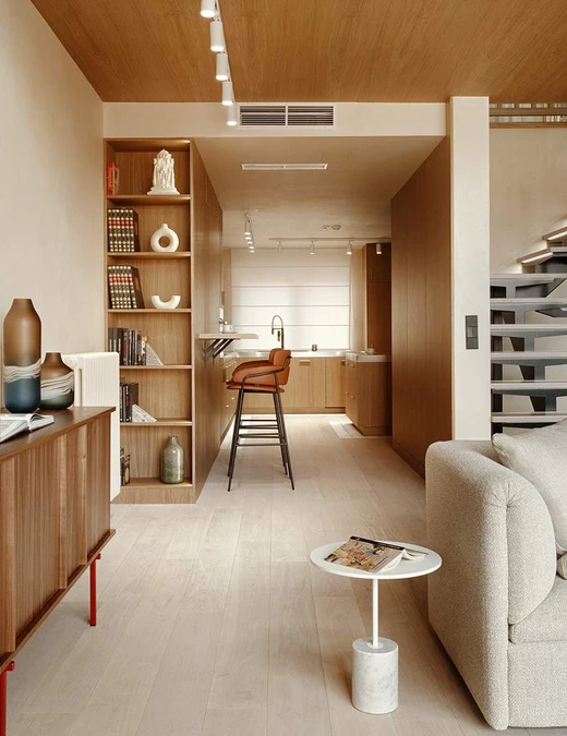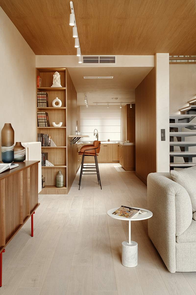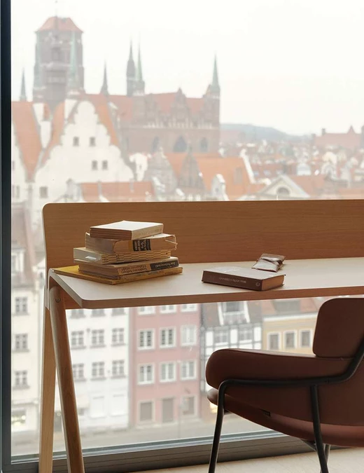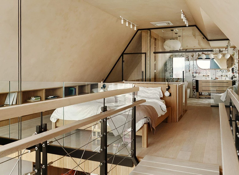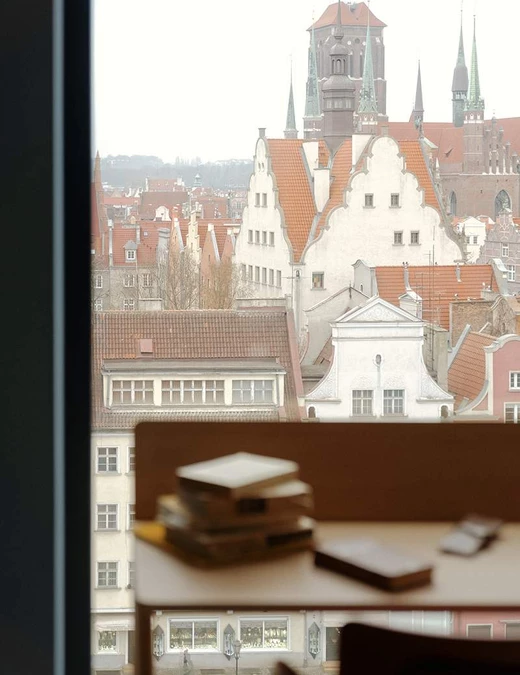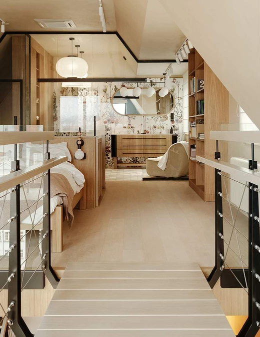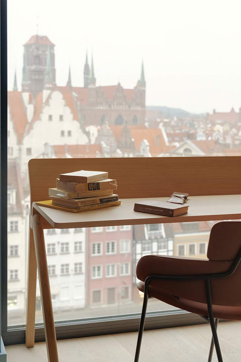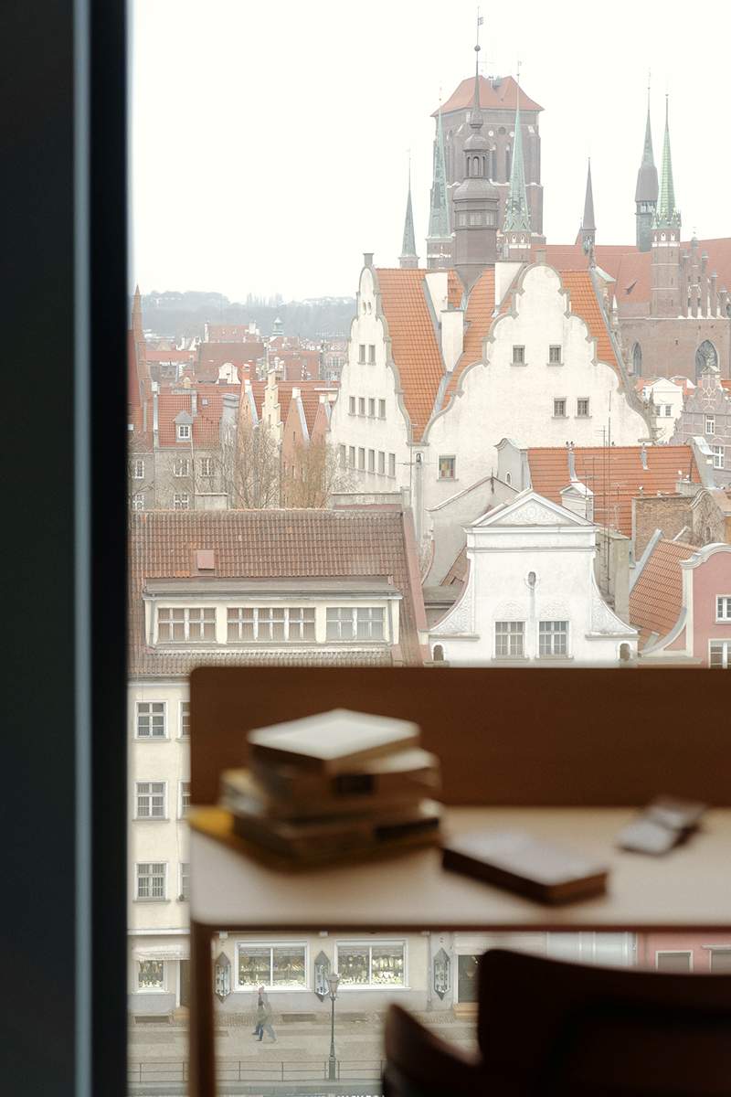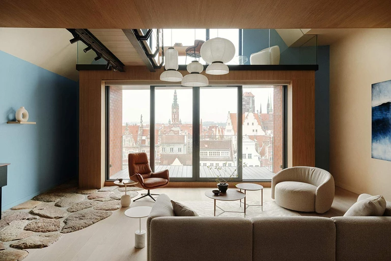 Układ apartamentu przypomina mały dom. Na parterze znajduje się strefa dzienna z salonem, kuchnią i niewielką łazienką, a na piętrze przestronna sypialnia z łazienką i garderobą. Dopełnieniem jest most zawieszony nad salonem, prowadzący do gabinetu. Z okien rozciąga się widok na ceglane dachy gdańskich kamienic i rzekę Motławę.