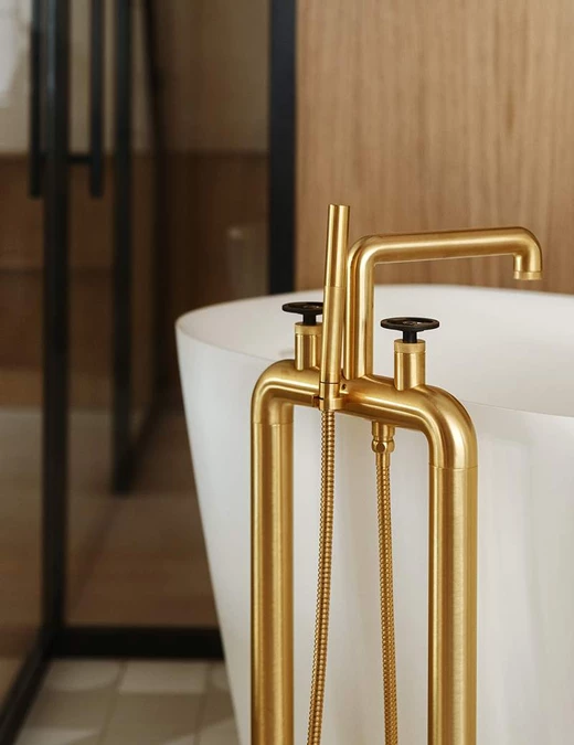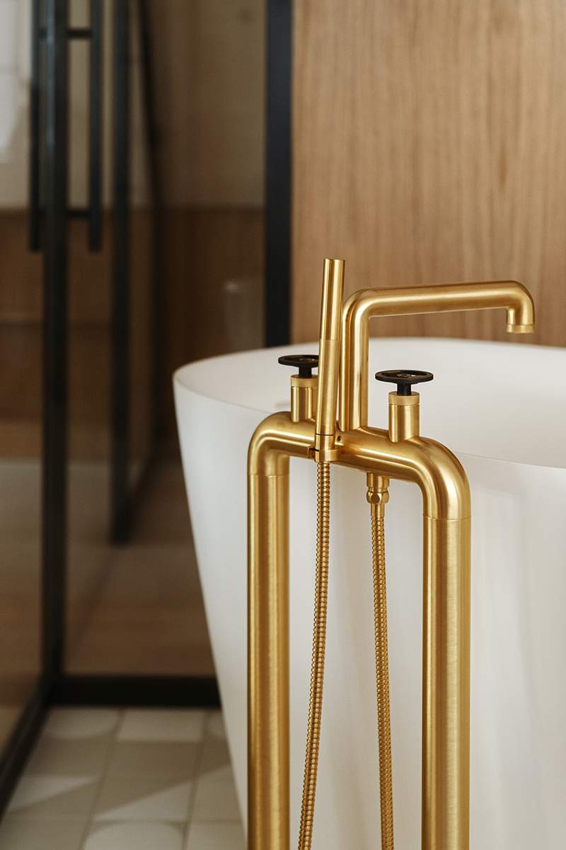 Na piętrze uwagę przyciąga łazienka z tradycyjną japońską wanną, florystycznymi detalami i mosiężną armaturą. W całym apartamencie poza standardowymi lampami zastosowano też oświetlenie projektowe, które pełni rolę zarówno funkcjonalną, jak i estetyczną, podkreślając detale wykończenia.