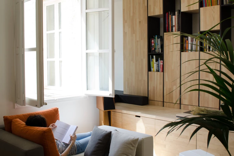 Dwupoziomowe mieszkanie znajduje się w samym centrum Bordeaux, w historycznym budynku. Za jego projekt odpowiada pracownia Atelier Miel. Ogromną zaletą apartamentu są okna: wychodzą one na wszystkie strony świata. Dzięki temu mieszkanie jest bardzo dobrze doświetlone.