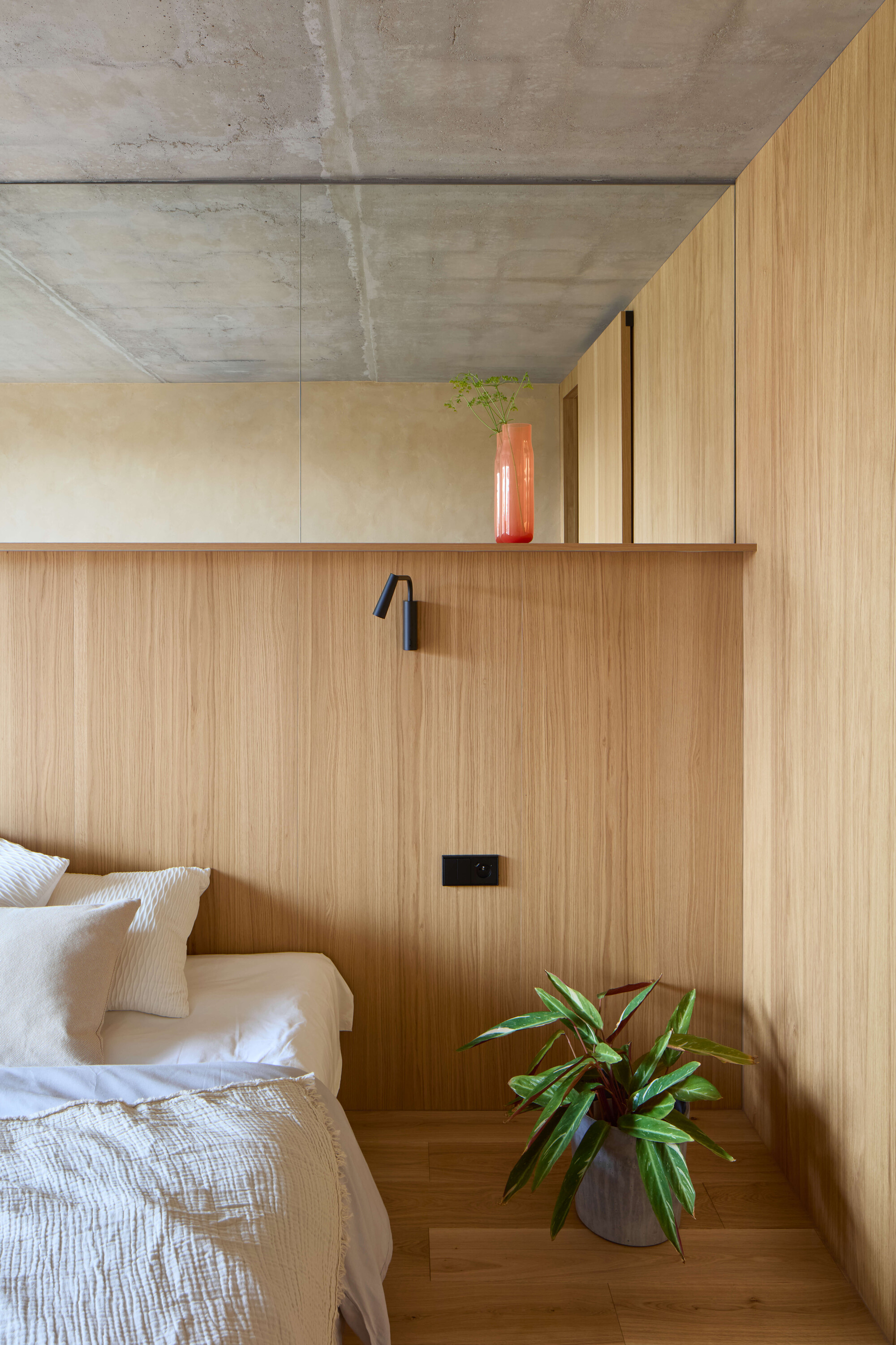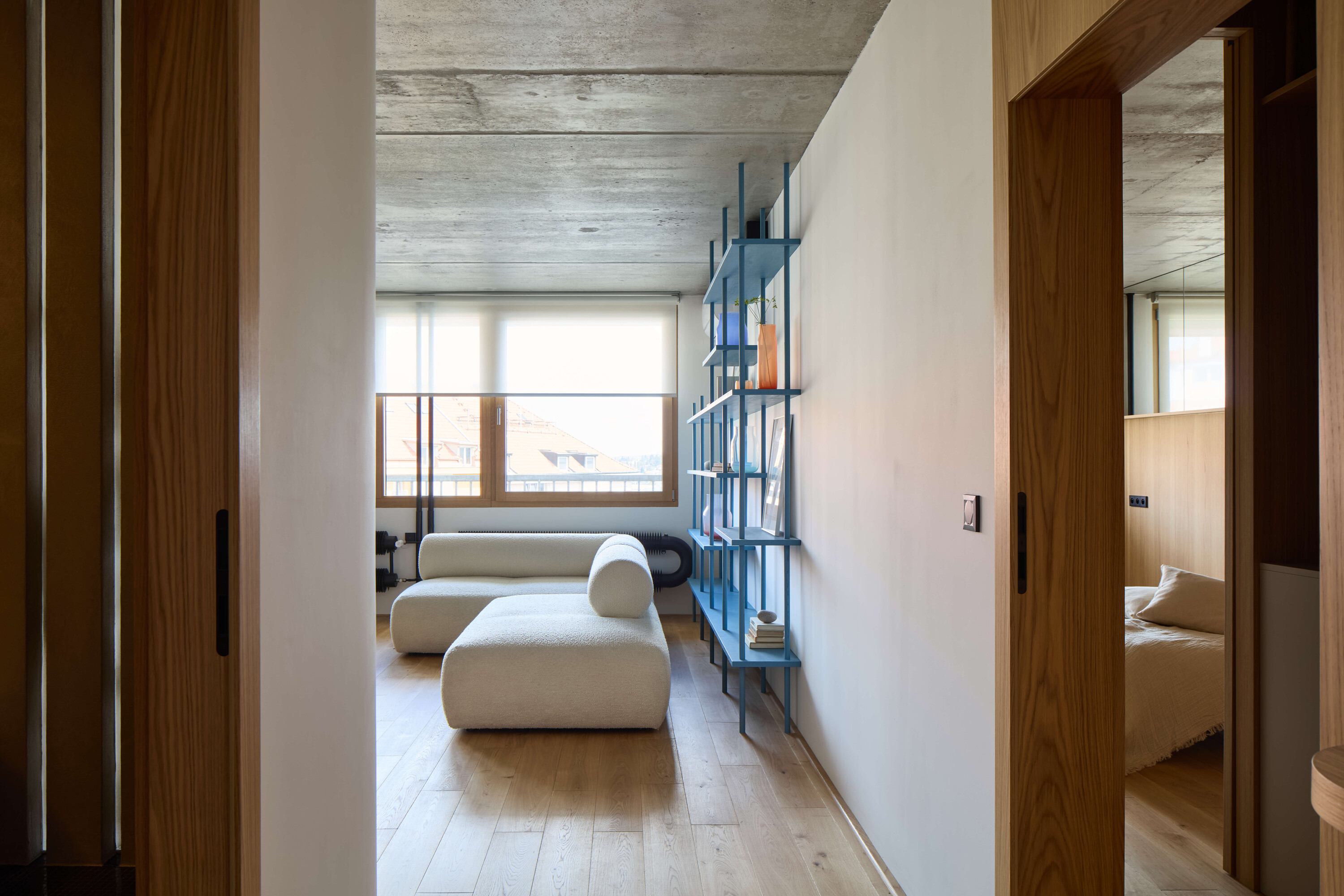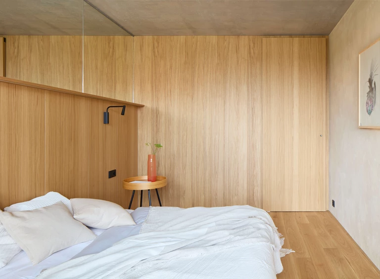 Kluczowym zabiegiem projektowym było odważne odsłonięcie konstrukcyjnej tkanki budynku. Zamiast ukrywać betonowe płyty, architektki usunęły warstwy starych tynków, oczyszczając i uszlachetniając surowe powierzchnie. Ten brutalistyczny element został zrównoważony przez dębową podłogę z litych desek, która w koncepcji autorek pełni funkcję „pokładu” – sceny dla codziennego życia domowników.